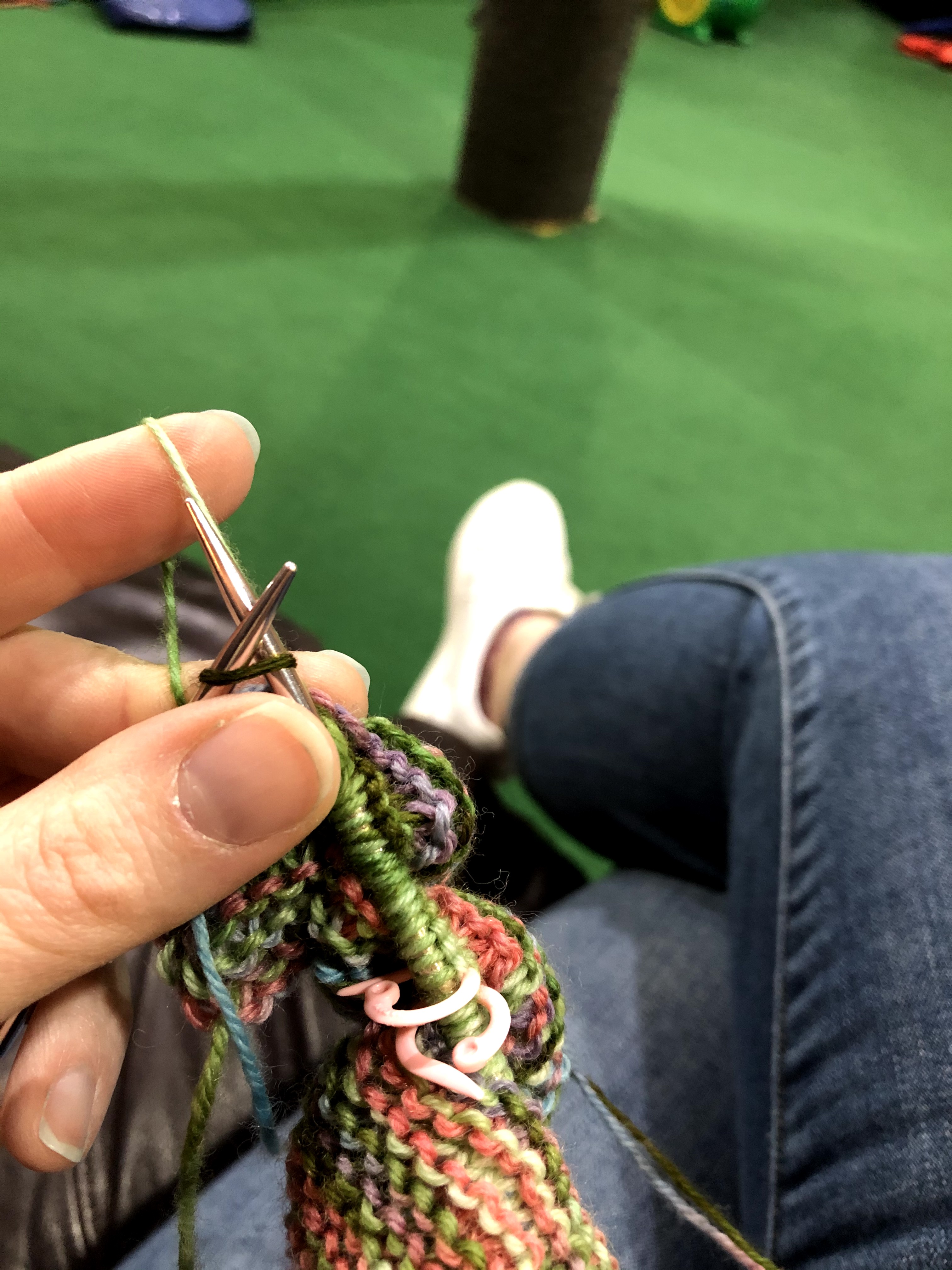 I swatched a couple color combinations on different size needles. My first combination of yarn and needles was abysmal. The size 2s had little drape. And the yarn wasn’t right. I don’t know what it is about this yarn. It was so pretty on the hank! But the repeats are so short that everything just makes it look “busy”. My second combination on size 4s blends really great. The yarns are Rabbit Ridge Designs in Limited Edition for FNYC (Far North Yarn Company in Anchorage, AK) and Knit Picks Stroll Bare that I dyed myself 10 years ago (give or take). The working name for the project is the “Spring Sprang Sprung Cowl”.