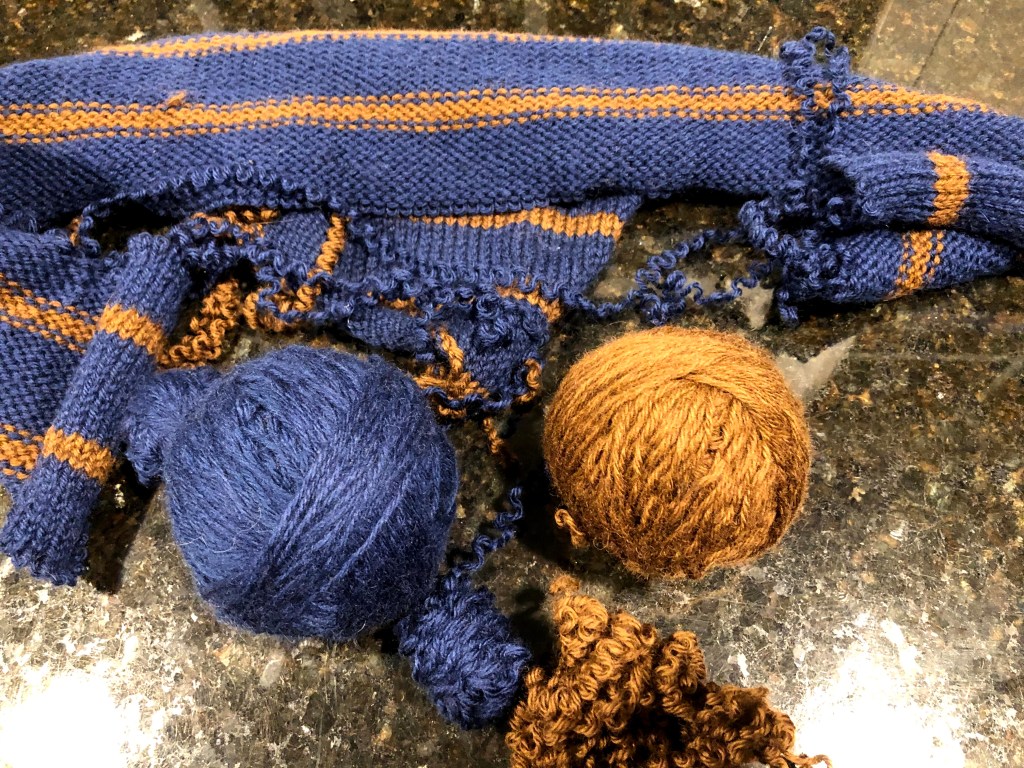 This week I set my sights on a project called the Prepster Cardigan. It was a make-it-up-as-I-go deal. I was going to do top-down set in sleeves, but I recall they were awful and I ripped those back immediately upon finishing the sleeve cap. The project has been hibernating since 2009. I started frogging it Sunday. Having wove in all the ends I wasn’t sure where I started/ended. So I started taking apart the fold under hem, assuming that was where I ended. It was a SLOG, at the end of EVERY row I needed to do something weird with the last stitch. This continued until about a third of the way up when I decided to try picking apart the shoulder seems and unravel from there. OH. WOW! What a difference it made, it was like unzipping a zipper. No weird tangles at the end of EVERY ROW, just a quick wind ROW AFTER ROW. I guess lesson learned; if it seems more difficult than it needs to be, I’m doing it wrong.