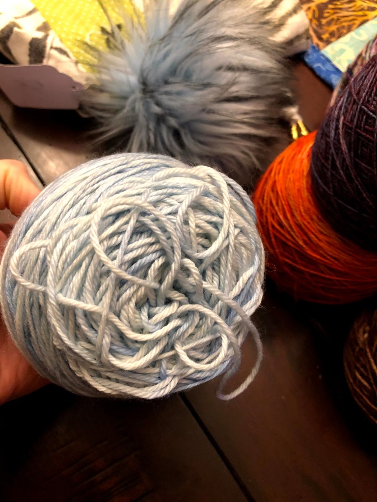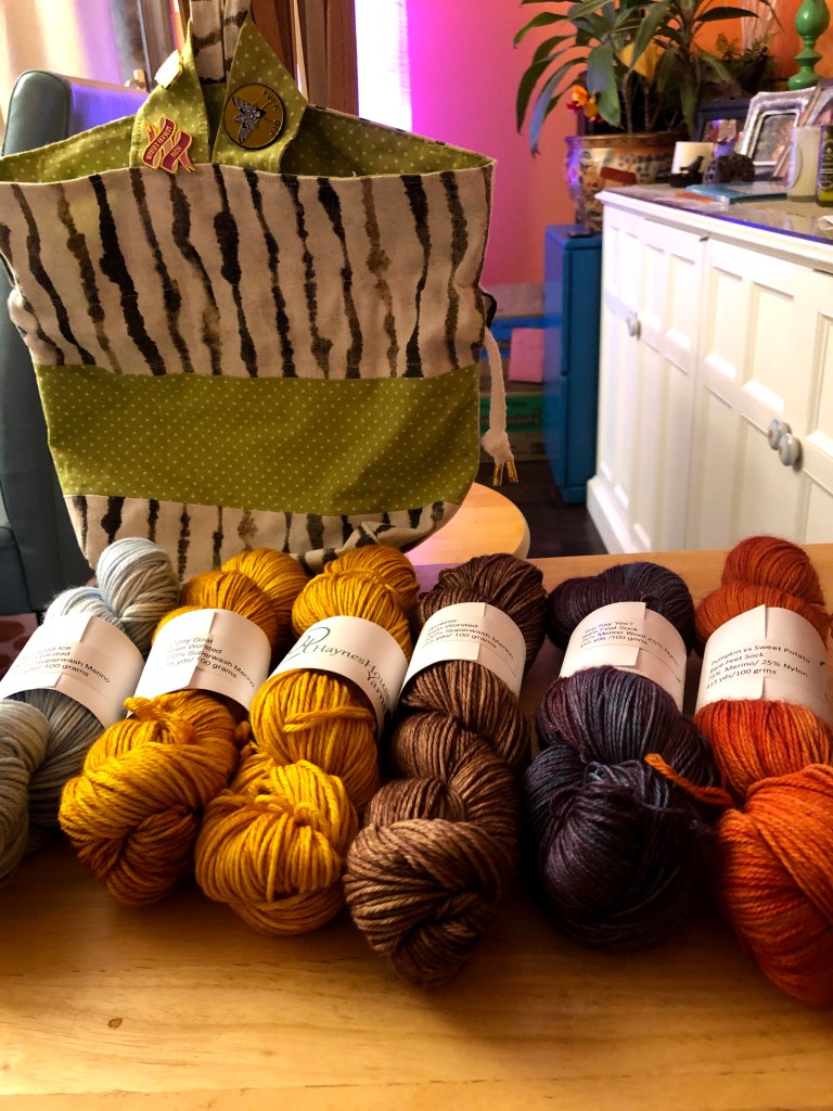 But NOW for the REALLY IMPORTANT STUFF. I totally purchased way too much new yarn this weekend, and a new project bag. One of my favorite, local, indie dye studios did a trunk show at my LYS. AT Haynes House Yarns is GOING PLACES. I met Terri at the Frederick Fiber Festival in 2019, and I fell in love with their colors, the bases, the stories behind ALL THE COLORS. I met her spouse, Brian, at the Knot House this weekend. We chatted about colors and him and I came up with some great color combinations that I CANNOT wait to knit. Not only are they both crazy talented (Brian makes all the bags!!!), but they are both so awesome to interact with. If they aren’t going to be at a store or festival near you, you HAVE to check out their Etsy Shop!! You will NOT be disappointed in the colors, the quality, or the SQUISH factor. I’ve purchased 11 skeins from them, SO FAR. I have encountered zero knots or poorly spun areas.