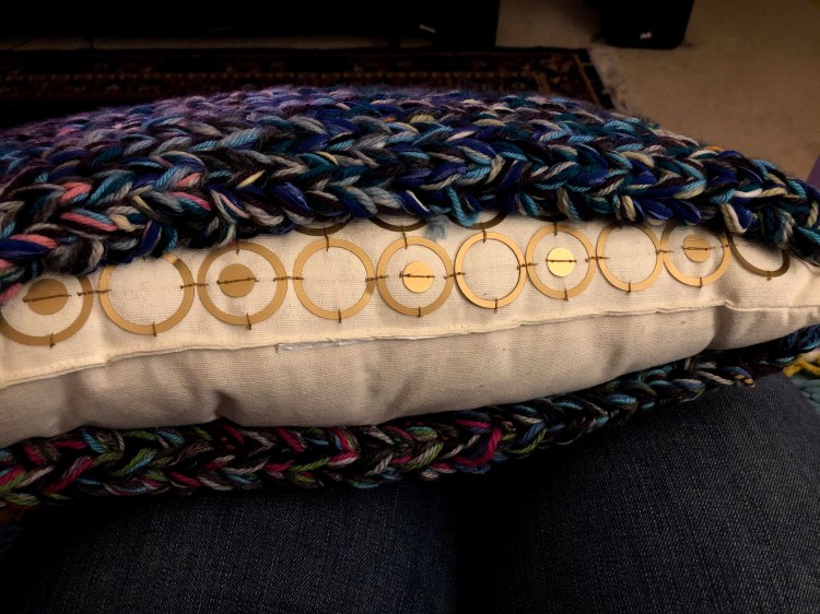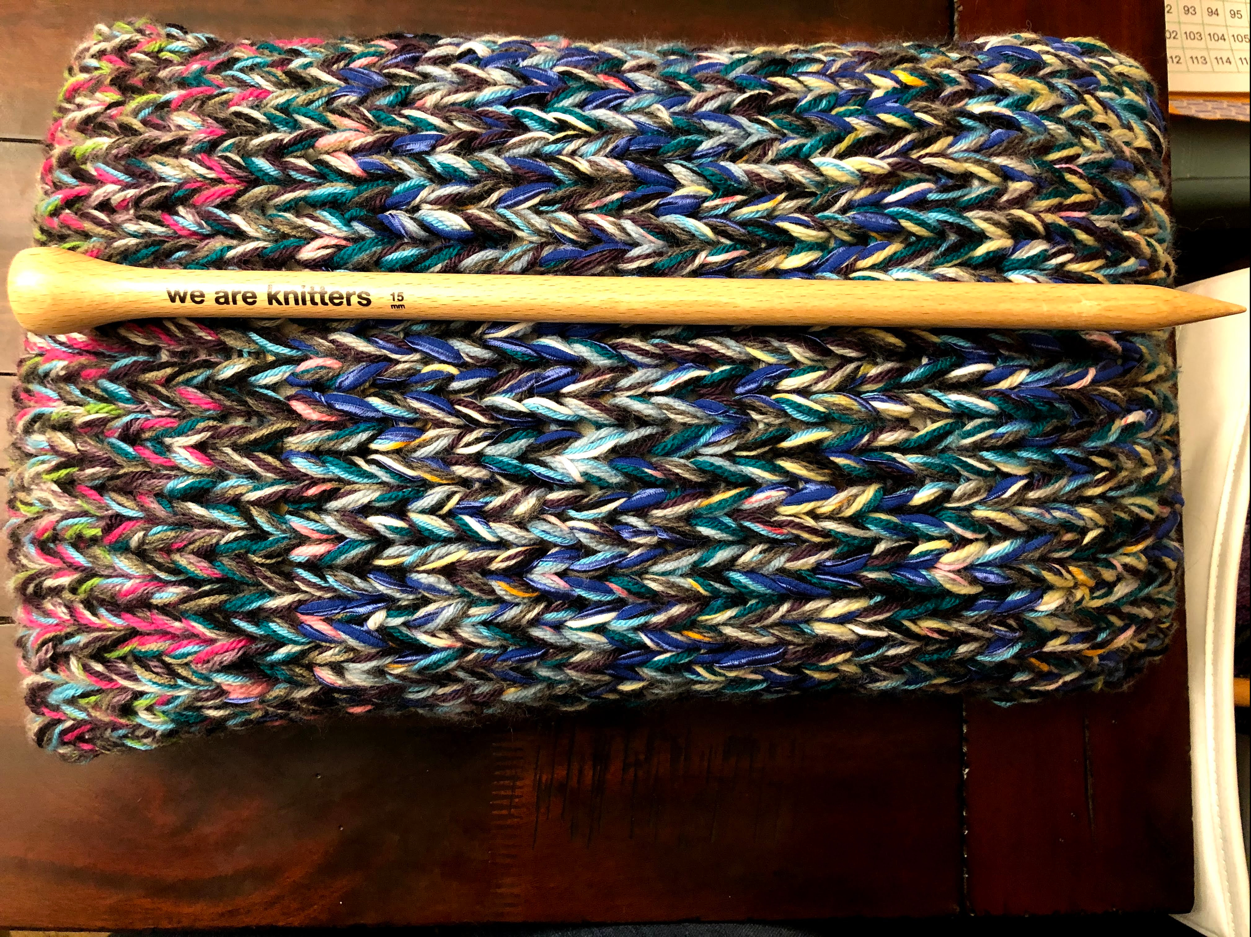 Today I solved a handful of problems with one solution a “Done-in-a-Day” project. I’ve been inspired by the number of absolutely STUNNING scrapghans that knitter and crocheters have been putting out this year. In the spirit of finishing it now, I decided to cast on for a pillow. I tried the size 50 needles, but they were just too big. I dug out my 15mm/19s. They were perfect. Chunky stitches. Not too unwieldy. Yarn Piggery abound.