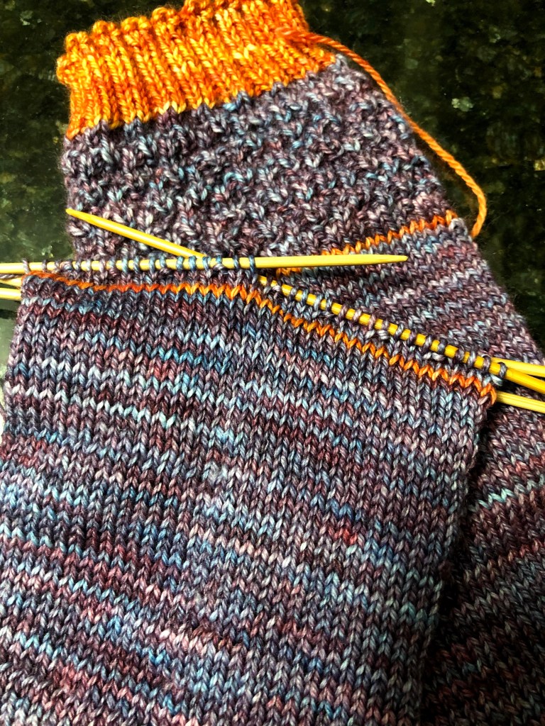 You guys! I’m SOOO jazzed right now, I couldn’t wait until tomorrow to share my excitement. My “experimental” “Say Yes to Pie” socks are entering the final stage!I added the heel row on the second sock. Only 31 rows to go until I can start the (new-to-me) HEEL!! I’ve opted to complete both heels at the same time.