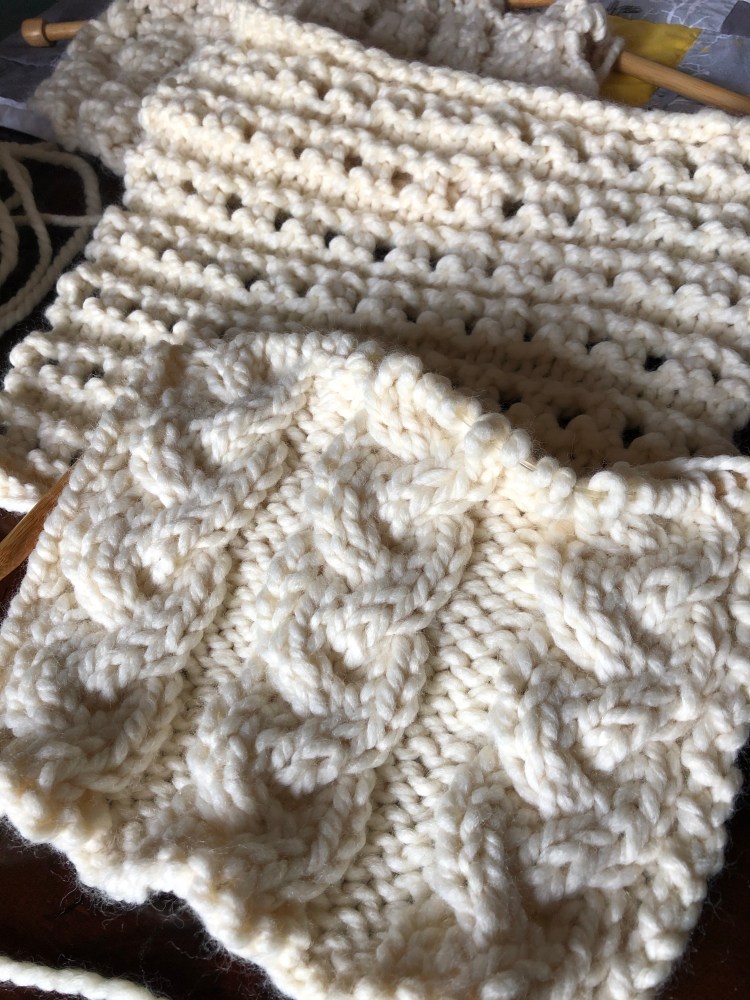 I miss teaching even more than sitting in a cafe alone with a book, my knitting/crochet and a steamy hot soy chai. After 3 months of NOT teaching, I was contacted by one of my students asking if we could do a virtual group class. OF COURSE! So once we agreed on a day, time, and platform, it was time to jump into creating class samples AND our instructions! Two of my students started the year with the KAL Afghan Block-a-Month at the big box store I teach at. Because of copyrights, I won’t use the teaching materials provided by the store. So we came up with two options to work up: an easy eyelet and an intermediate cable. I adapted both stitch patterns to meet the needs of our long-term project and both stitches have instructions on how to turn the stitch into a scarf using a different weight yarn.