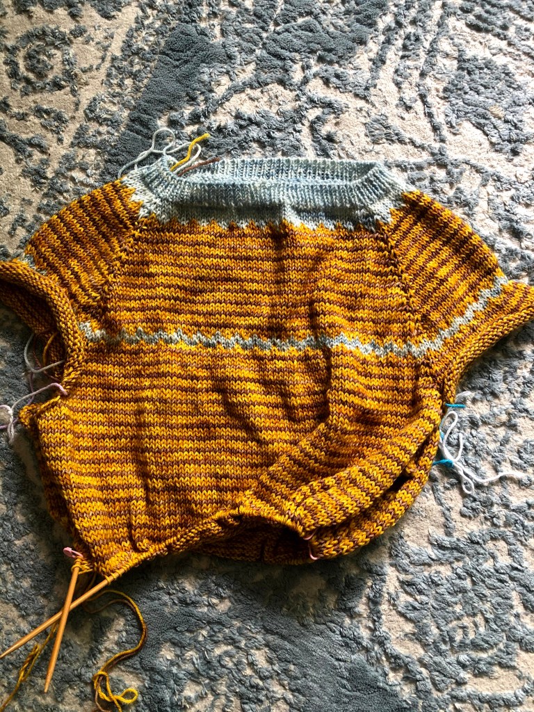 My other large project, Faire Stripes Sweater, is making reasonable progress. I’m just working on 12-14″ of body before I add the blue back to the body and work a bunch of ribbing. Then ONTO THE SLEEVES! The are going to be half sleeves. Or until I run out of yarn. I’ve 860 yards total to make this 44″ sweater. I haven’t knit a worsted weight sweater in a couple years. Its going REALLY quick!