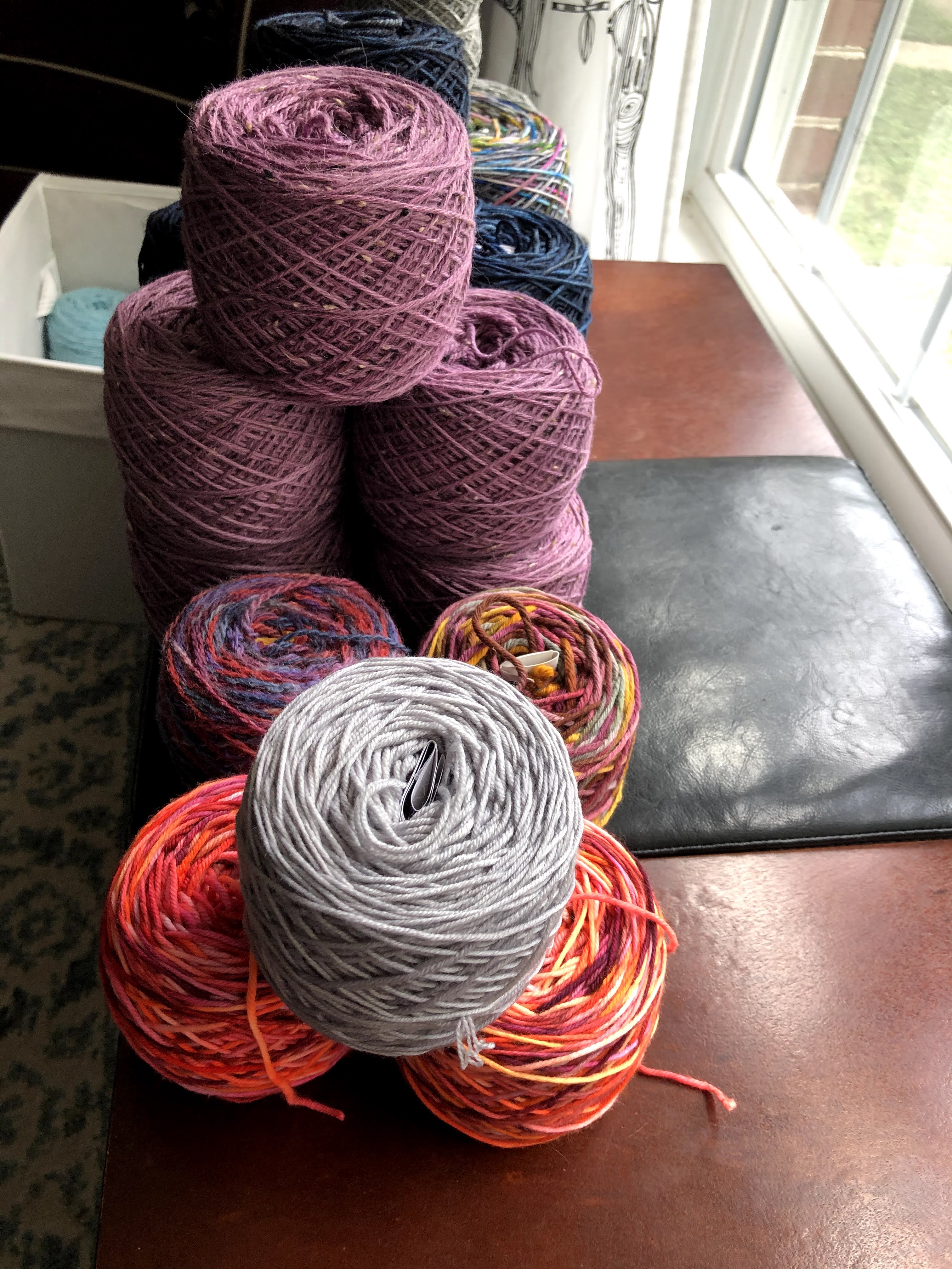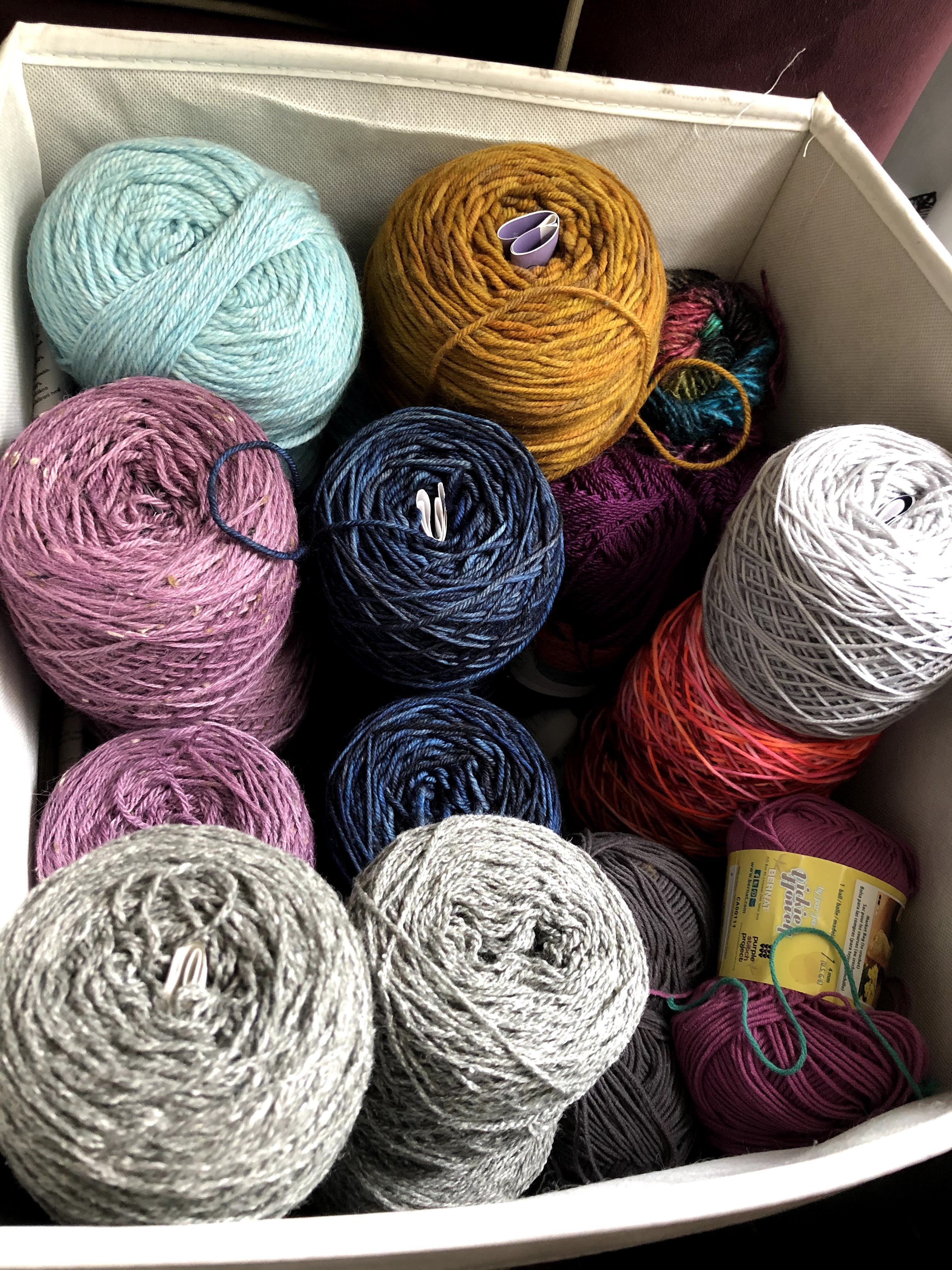 I wound sweater quantities of 3 yarns: Shalamar Yarns Equus in Mephisto Waltz (a black blue) that I purchased at a Studio Open House back in 2017, Queensland Collection Rustic Tweed in color 925: a lilac/mauve tweed (discontinued) purchased sometime between 2009 and 2012, and Elsebeth Lavold Silky Wool (in discontinued color 03- gray) that I purchased in late 2019. Other fun treasures: an Alpaca spun and dyed on a farm we visited in 2016, Miss Babs Yowza in maybe Newsprint? (I think that was the name… I don’t have the ballbands) that I purchased from MD sheep and wool in 2013, Haute Boheme Fibers Mimi DK in Apo purchased at the Frederick Fiber Festival in 2018.