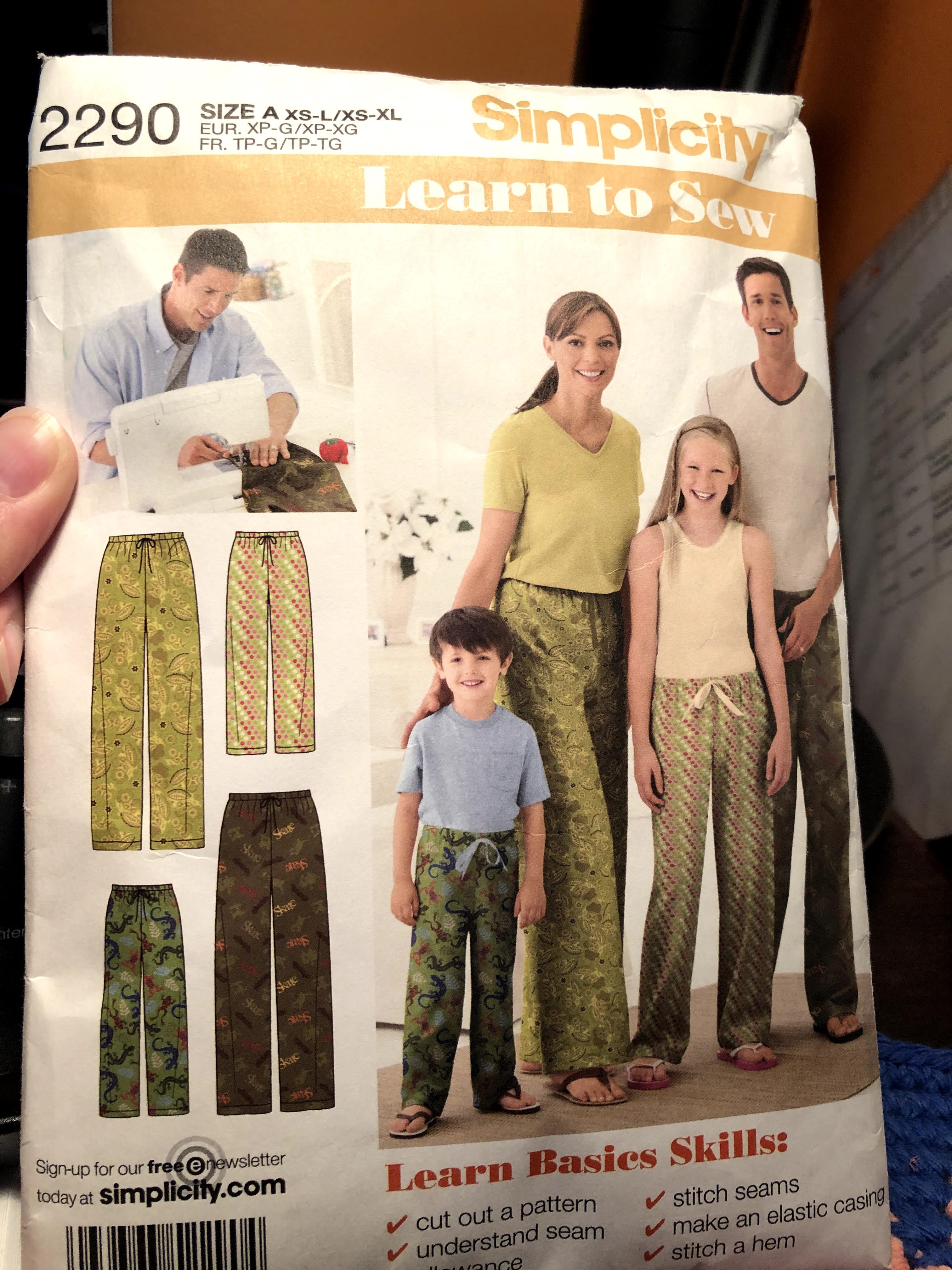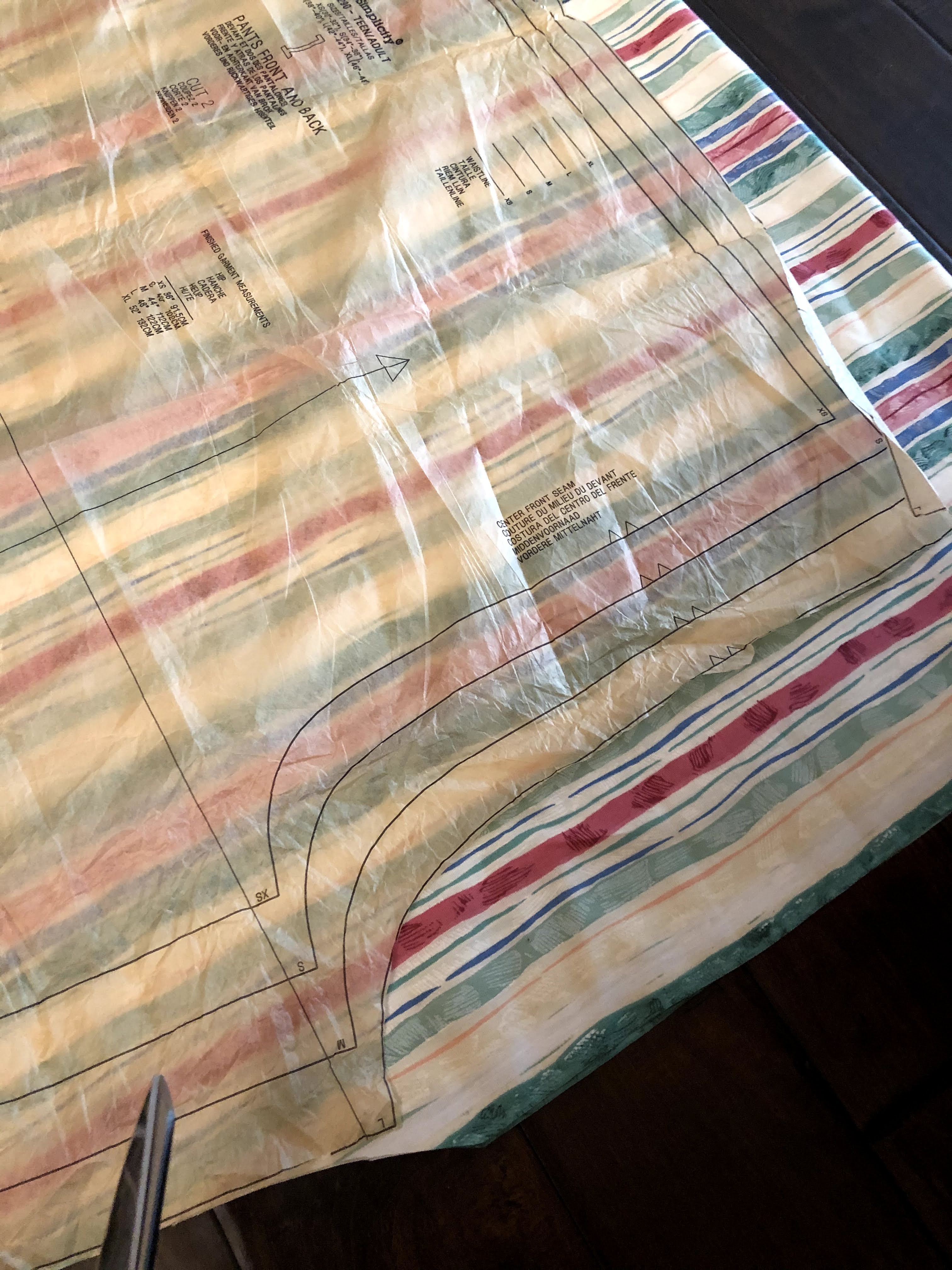Which brings us to today. That stripe? Oh yeah. I STILL had a 3 yard cut languishing in my stash of fabric. I was going to turn it into lining fabric of fabric face masks that I’m sewing to donate to local schools. It looks like an old sofa. Or some hideously dated curtains. The spouse and I were discussing the awfulness of it one afternoon when it dawned on me. IT NEEDED TO BECOME ANOTHER PAIR OF PAJAMA PANTS FOR ME.