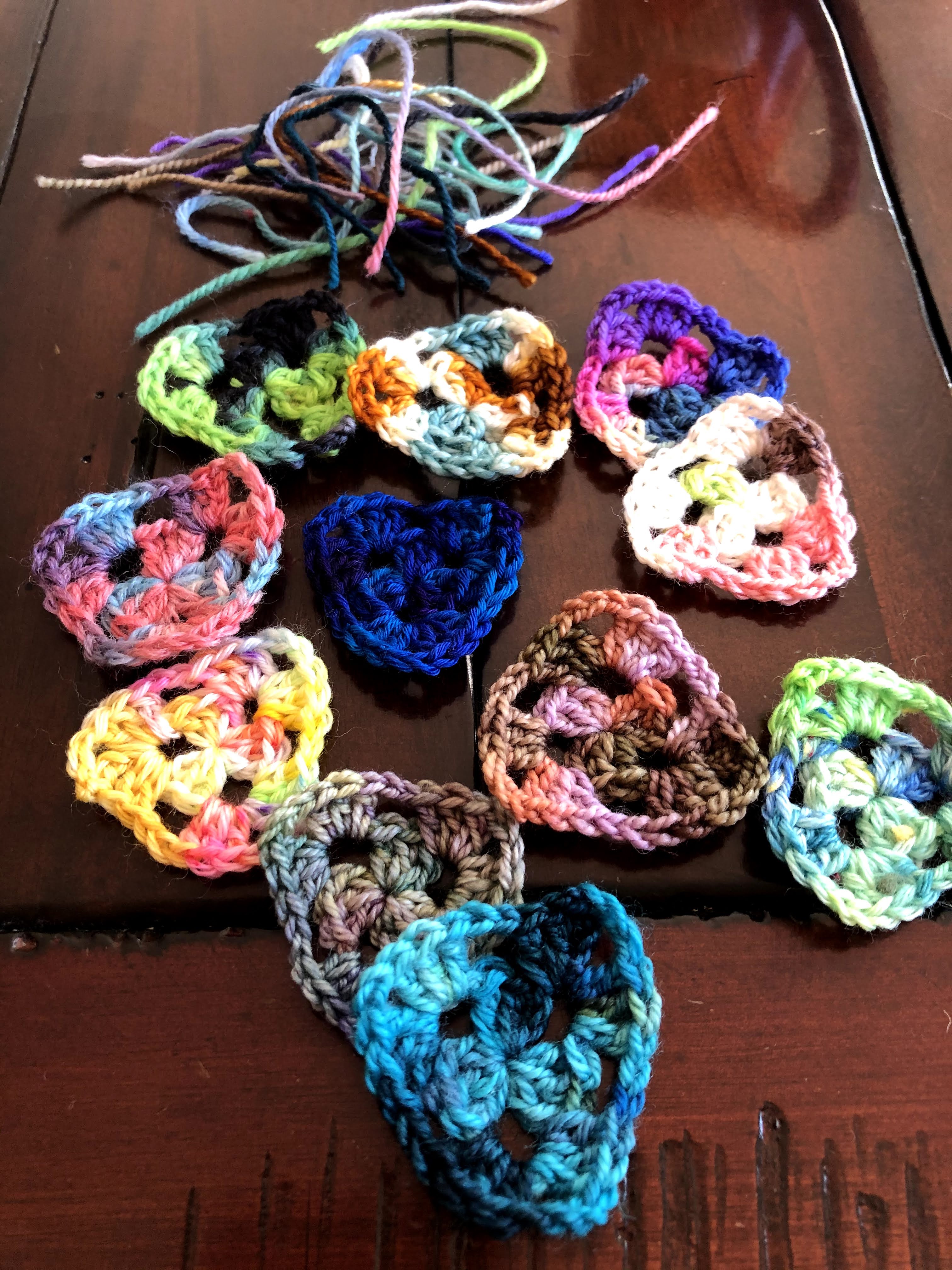 Inspiration struck me the other day regarding my bits of sock yarn! With about 10 feet (3m), I can make these 2-row granny triangles!