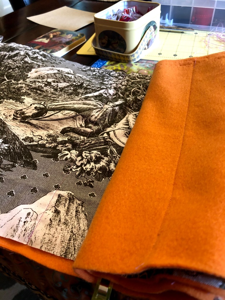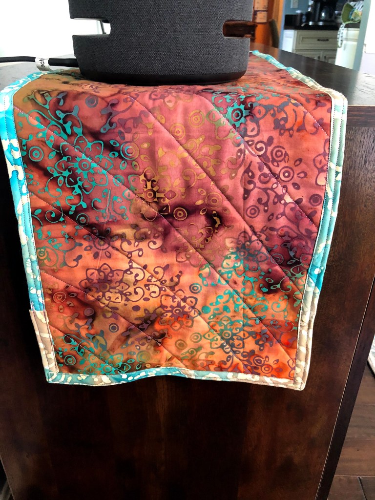 Saturday I took measurements, gathered my materials. For the back: some weird brown pastoral scene fabric I purchased from Walmart. Reasons unknown- likely from 2000-2006. I didn’t have any batting left from my last runner, I improvised with some BRIGHT ORANGE fleece leftover from Halloween 2016 or 2017. I had used it to make a shift dress for my Mommy Pig (from Peppa Pig) costume. For the top, the Batik I’ve been admiring on its pedestal. The fabrics were all 43″ lengths. I cut the Batik in half, measured, then cut equal width pieces from the back and the batting. Sewed the ends together to make a continuous length. I stitched the batting to the back, I don’t have any quilters spray adhesive on hand. Freehanding (with copious clips and pins) a hot pad presented me with lots of shifting fabric sandwich situations- lesson learned! I used LOTS of clips to secure my fabric sandwich. I stitched the top and bottom long sides to further prevent shifting. Spoiler: It worked!!! Then I quilted on the diagonal to the center, eyeballing the width and slope of the lines. I flipped it over and worked the opposite side. I made my own Bias Tape on Sunday, a task that I’m not fond of. I used a continuous strip tutorial. I get it now, but the first attempt was too narrow, 1/4″ wasn’t going to work. My second attempt was 1/2″ double fold.