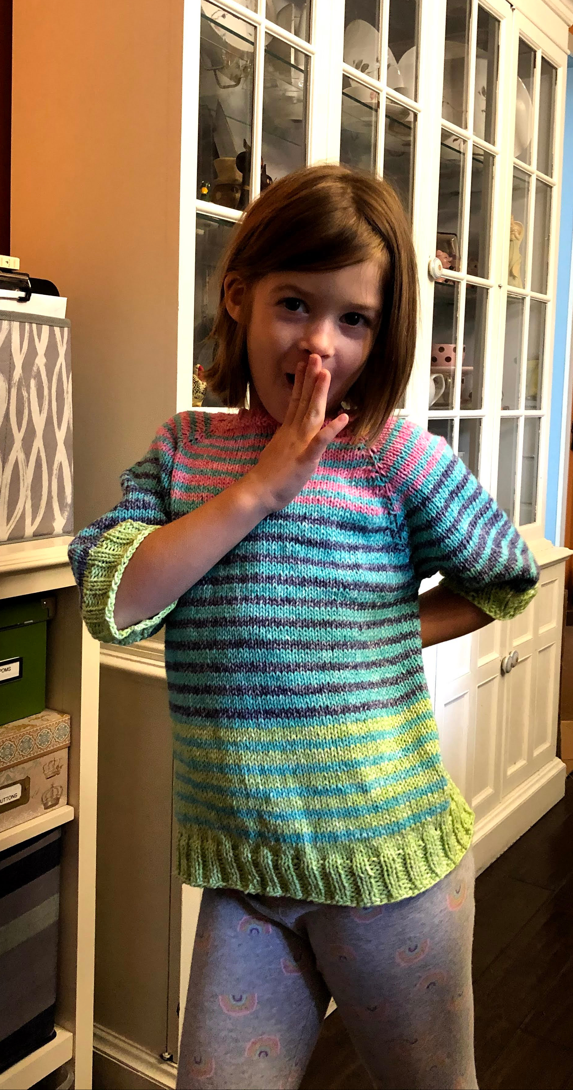I finished my project dubbed the HPW Stripe Sweater this morning while my kid was doing virtual school. Just a basic top-down raglan with no formal pattern. Steps were: Cast-on, rib, increase, divide off sleeves, body, rib, cast-off, pick-up sleeves from their holders, work sleeve for a bit, rib, bind-off, repeat for second sleeve. I measured gauge to get an approximate number of stitches required for a torso measurement of greater than 23″. When I first envisioned the project, I underestimated the amount of yarn required, and didn’t think I would need the light green. My kid has a longer torso than I thought! In retrospect, I had enough yarn to make the body 2″ longer- NOT going to go back now.