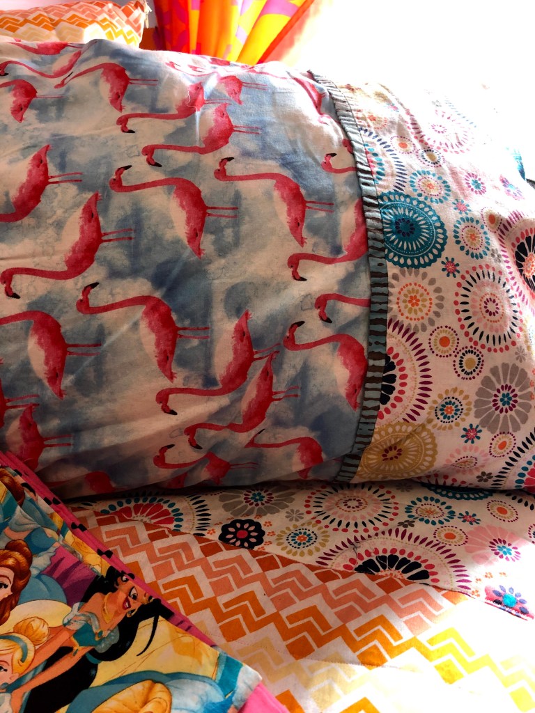 I started the quilt back in 2017 or 2018, I wanted to make a quilt for my daughter when she transitioned from a toddler bed into a twin bed. Well…… I made most of the top and then lost steam. Its what I do. I think it turned out pretty good. I had a couple pieces of fabric leftover to make the edges of a couple of pillow cases, the front of the one that echos the quilt. I wanted to make a decorative sham style one, but wanted it to be reversible. I had a 20″ zipper hanging out in my sewing accessories drawer that was perfect for the pillow. I backed it with some unicorn pegasus fabric I picked up to make more PJ pants out of, since my kids have both grown 6 inches taller since I last made them PJ pants. Soooo coordinated.