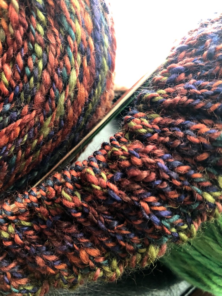 I’m toying with the idea of marrying my handspun rib cowl and my chaos cables cowl. Working the 2×2 rib is a bit tedious over 300 stitches. I might get half through the handspun and measure, if its not deep enough, I’ll splice in the green cables section in an 8 instead of the size 6 ribbing. FUN!!! A 1000 yard cowl. I have sweaters using less yardage.