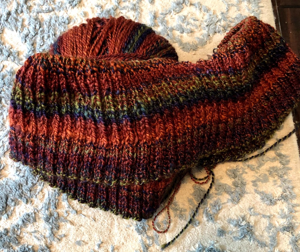 I thought I had an idea about the cables for the green midsection, but now I’m second guessing my initial choice. I don’t want to add a bunch of stitches. 300 is enough! I could modify the panel width to be divisible into 300. Maybe the cables aren’t “chaotic” enough. They are slightly skew, but not really as irregular as I envisioned. I will need to review this before I boldly forge forward. I’m not second guessing my green, yet. I hope to have some pictures for my Sunday YOP update of this project.