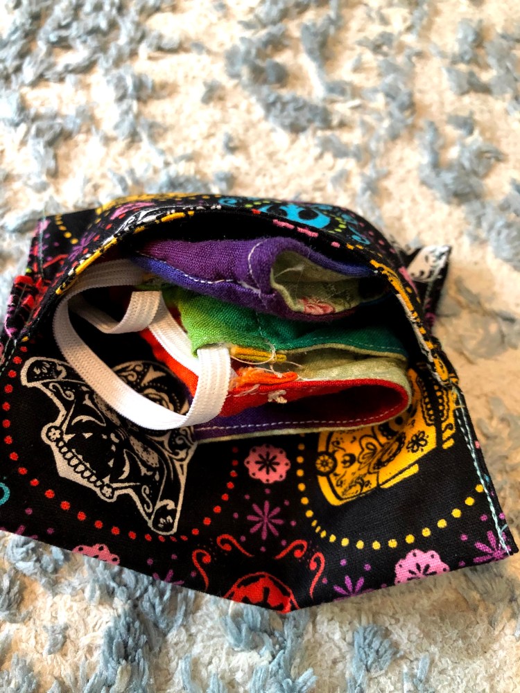 I did have a fun sewing project from the other morning- a couple of mask holders. I do outdoor fitness classes a few (2-5) days a week and I need to wear my mask whenever I’m not actively engaged in class. But tossing it on the ground seems gross and counterintuitive to what my mask is for. So I played around with various ideas to make something to hold my mask. I wanted something simpler than a zipper or a drawstring, but something that was semi-closed so when in a purse it wouldn’t fall out or attract nastified bits of whatever.