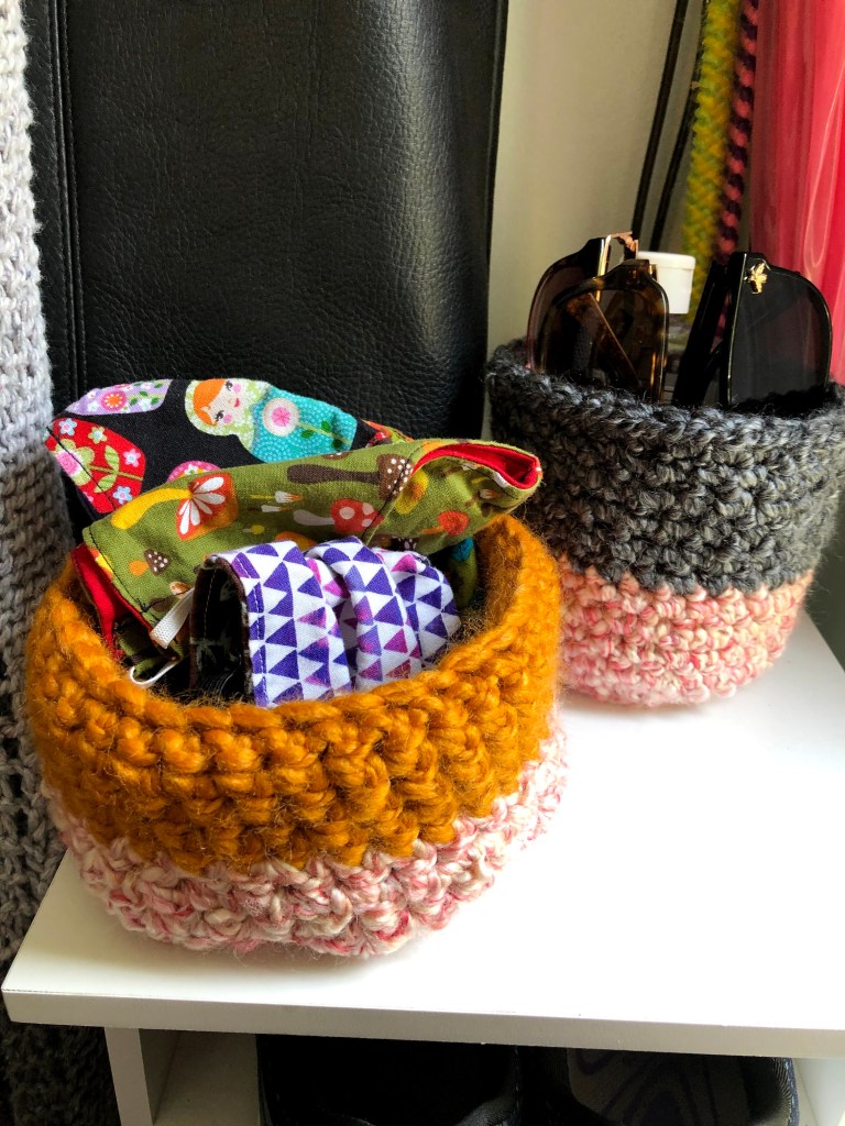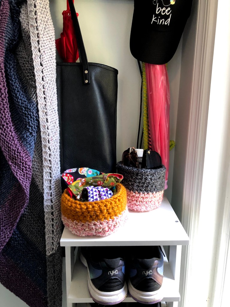Yesterday I got the itch to work on some small projects to corral masks for myself and the kids. Our entryway is SUPER tiny, so making the most of my space is important. Additionally, since my space is SOO tiny, keeping it organized is a must. Disorganization looks like a huge mess. I made three projects, 2 baskets and a little flat pocket.