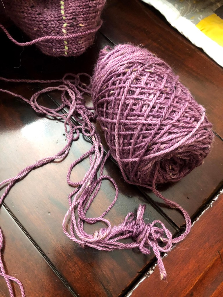 Which brings us to me working from both ends of the ball. The yarn tangle looks AWFUL. I decreased the sleeves to do the ribbing, but need my DPNs to finish. I speculate that I will need less yarn to do the plackets and finish up the neck line than I will need to do the bottom ribbing. I currently have a little over an inch of bottom ribbing, with a desired ribbing length of 3-4″. I’m not ready to cut the sleeve yarn and reattach it later. So I’m working from both ends of the yarn as I attempt to make the most of my materials.