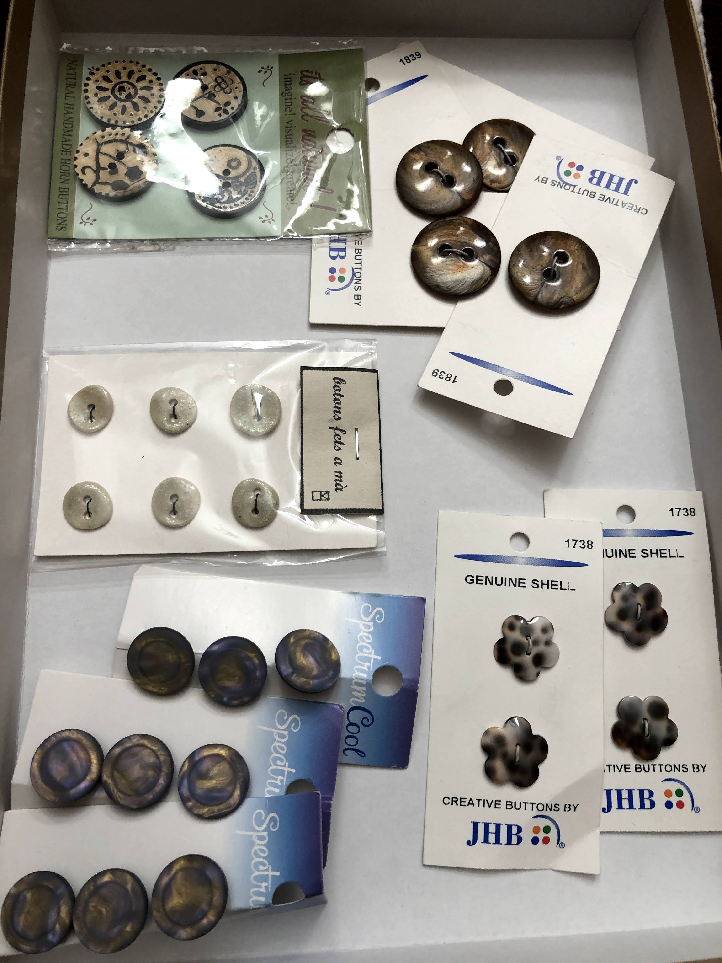 Which brings me to buttons. I forgot all about closures until the other day! Today I rummaged through my button box. It is pretty wiped out. I don’t really know how many buttons I want. But it is significantly more than 4 (maybe 8??). Which is what I have for most of my appropriate buttons. I saw some really nice ones when I was at the Flying Needles in Williamsburg…. But $60 for 9 buttons seemed unreasonable to me. This isn’t the type of project that, I believe, needs stunning handcrafted buttons. Perhaps I’m just being overly frugal.
