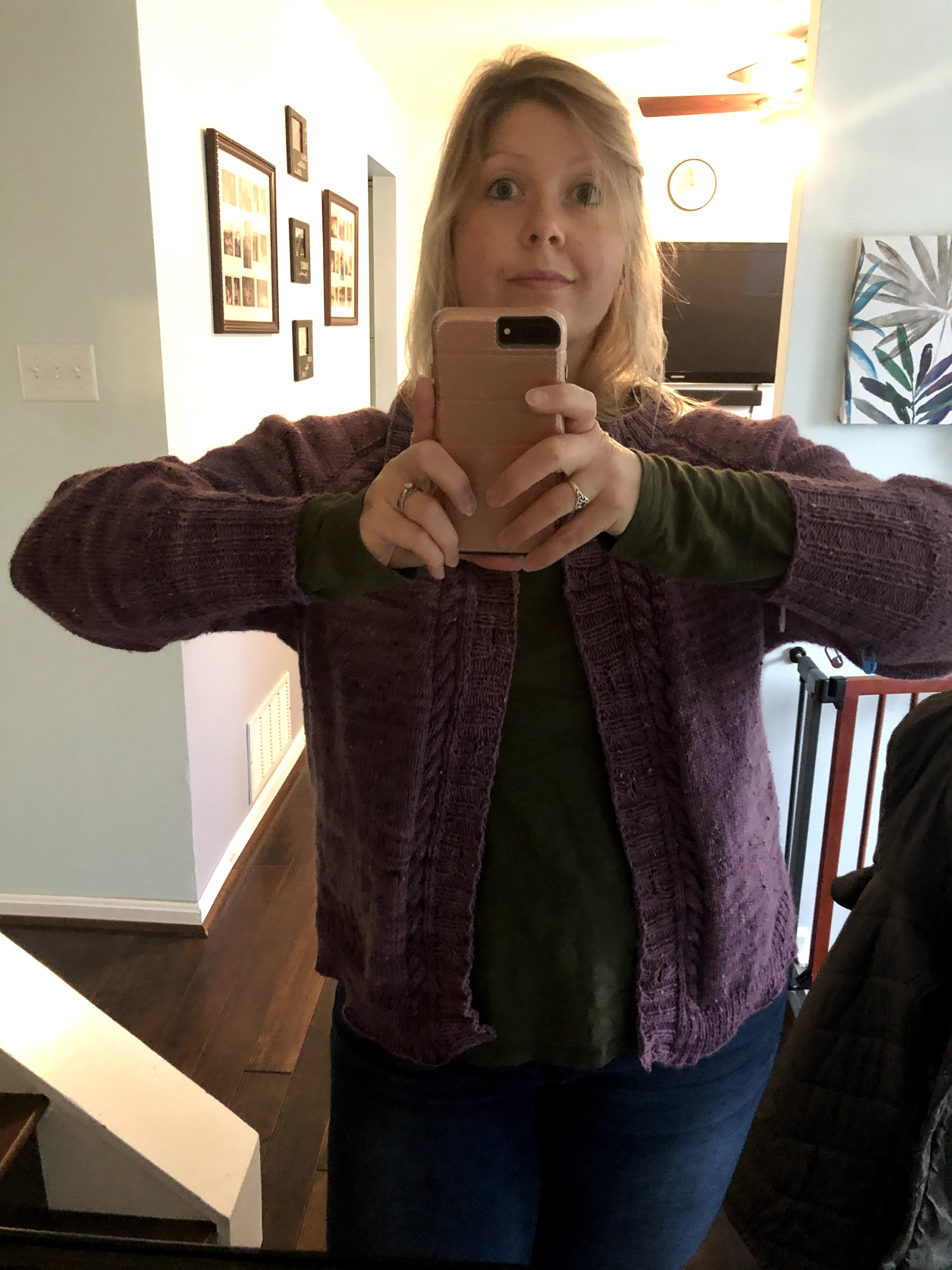 Winning with a finish this week! I completed my Cardi B on Friday, and blogged about it here. I love it, I have just a little bit of yarn left, but am counting all 5 balls as being gone from stash. My only wish: it was chilly enough to wear around the house! Yes, I believe blocking WILL fix the button band not laying flat. Also, eventually buttons (LOL).