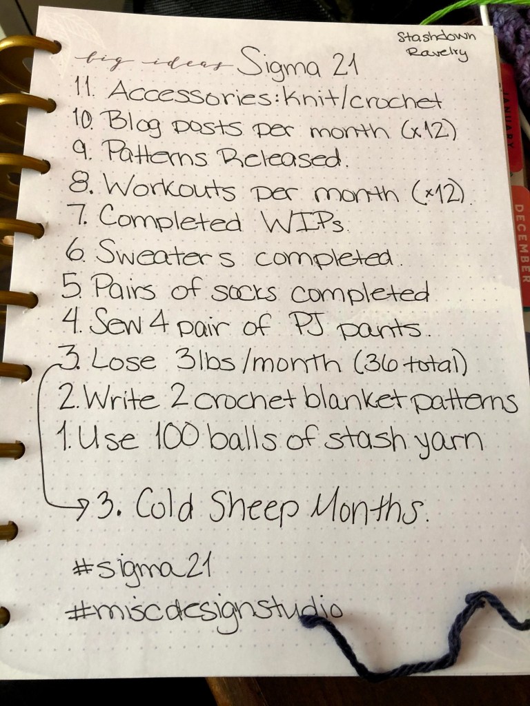 I’ve already made my Sigma 21 goals!! Some of them are low bar/easy, because I am counting baby sweaters in the Sweaters count (and my bestie is expecting a baby). Some of the goals are not crafting related: I do want to shed the weight I’ve gained this year…. it was rather substantial. BUT it’s paired with a crafting goal: 3 months of NO YARN BUYING. I’m going to try to Cold Sheep, just a little.