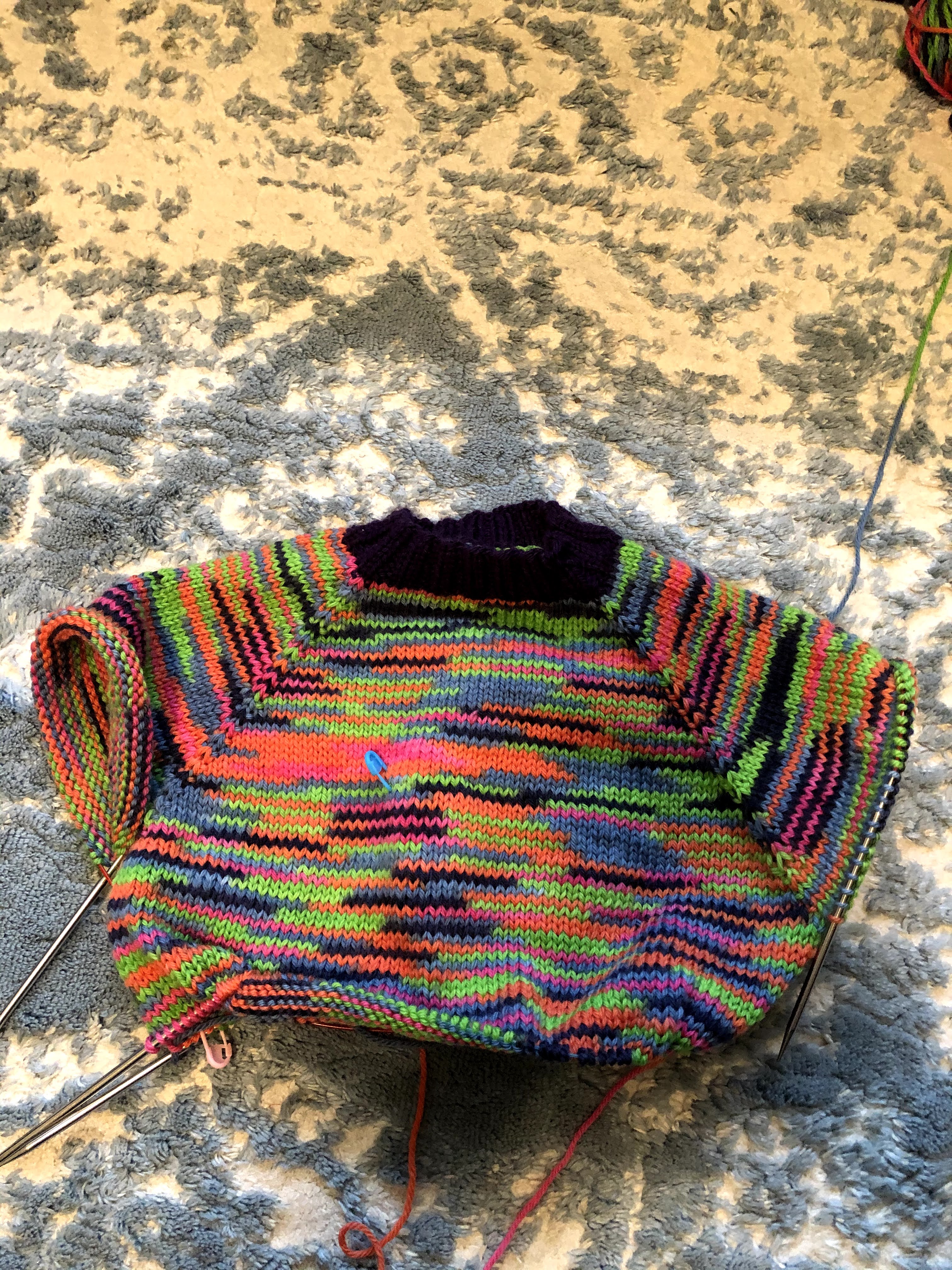 Here’s this week’s cast-on. My daughter needed a replacement for a sweater I knit her a couple years ago. She picked out the yarn when Love Crafts was having a sale. Cascade 220 Superwash Sport Multi in the colorway Punk. I’m using stash, Cascade Superwash 220 Sport in colorway Royal Purple for the trim. She said she wants a sweater dress (knee length) with a ruffle at the bottom. I have almost 1000 yards total. Since she is 6, and completely average in size (according to the WHO charts my pediatrician uses to measure growth), I without a doubt have enough yarn to make this happen. I split off the sleeves onto a long circular for 2-at-a-time sleeves. Never done it before, it would be prudent for me to use a lifeline… However, I like to LIVE DANGEROUSLY. When I finish up the ball I’m using for the body, I will do the sleeves. What could possibly go wrong?
