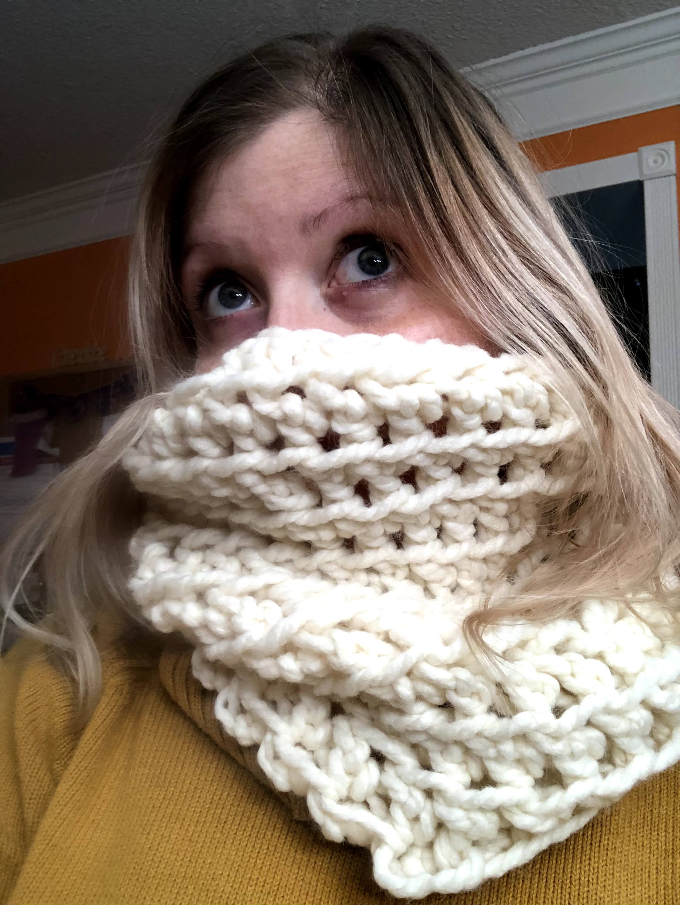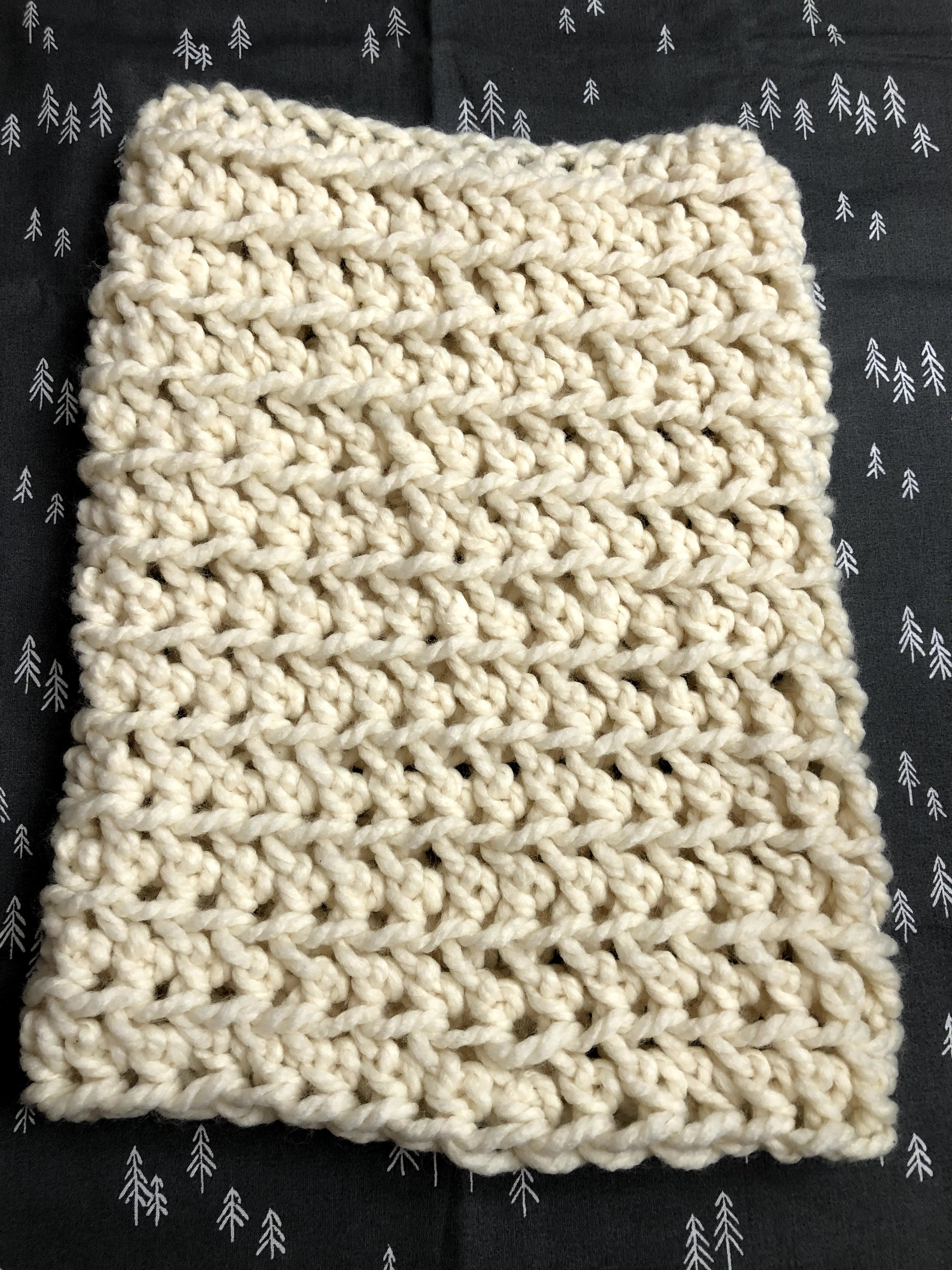 It also is me working on a quick project in the middle of a big project; I’m taking a break this afternoon from the HPW Sweater Dress. About a year ago, I released a crochet pattern called the “60-Minute Cowl” on Ravelry (link goes to the free pattern on Ravelry). Honestly, for a moderately quick crocheter, this can be finished in under an hour. Today I completed another one, I think this is my 5th one? I now have 2 in my Rav project page.