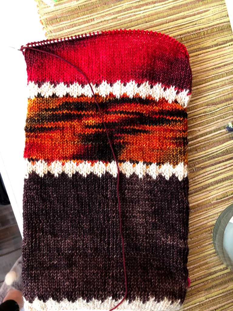 This is what I have on my advent project so far. I was going to do 40 row blocks, but figured the center colorways would get lost. I didn’t want to rip back, so I will incorporate this into my design as a FEATURE. I’m going to do day 14 as a 40 row end block. All the “center” blocks will be fewer rows, but repeated twice! Because I want to see all those beautiful colors. My intent is do work the days in order (minus Day Three because I have other plans for that color). The pattern will have options for a scarf or a cowl!