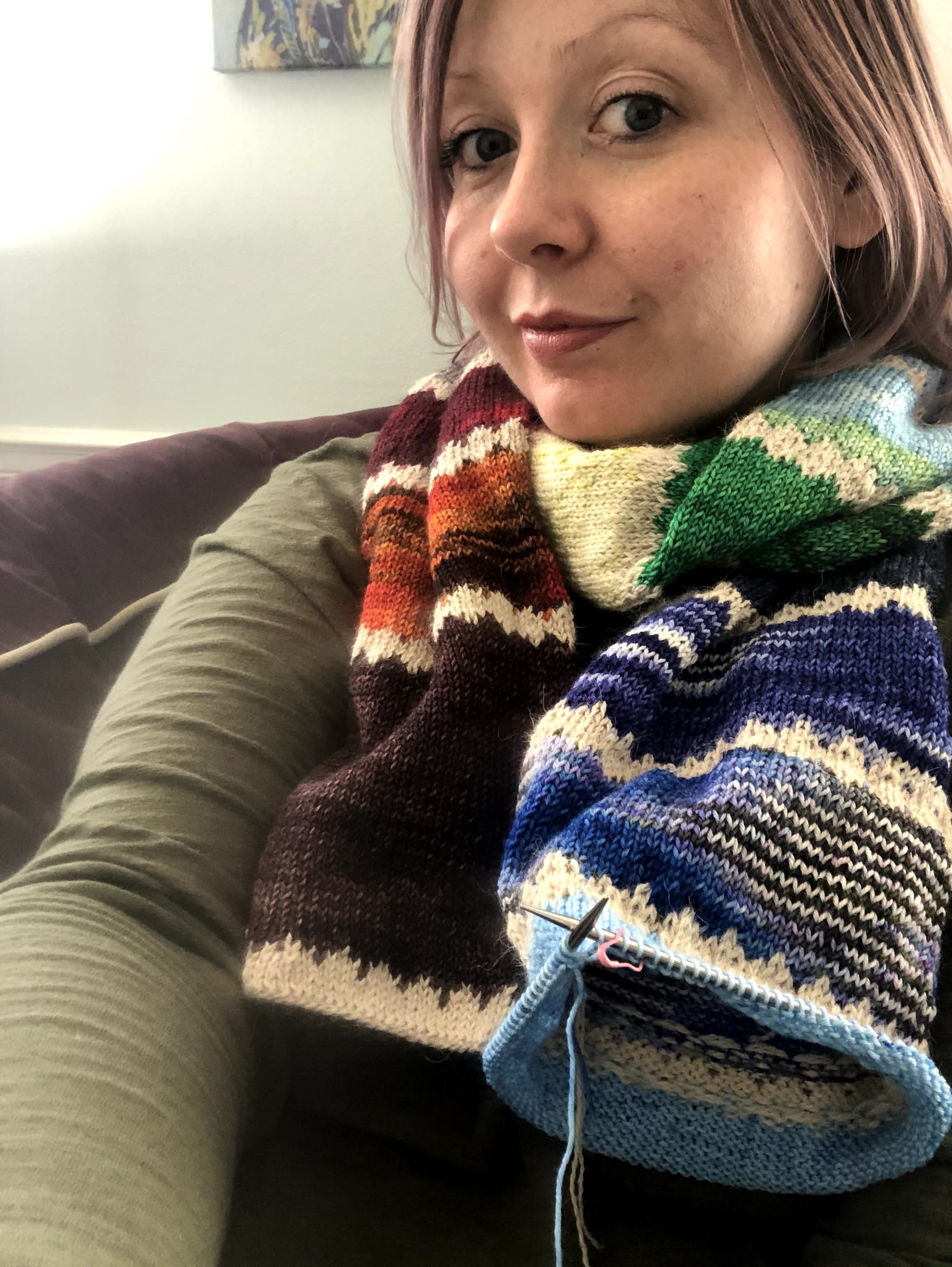 While binging on an awesome book, I made a TON of progress on my Right Round Scarf! I have 4 or 5 more sections to go!! I tried on my WIP today! I’m thinking I can have it completed this weekend.