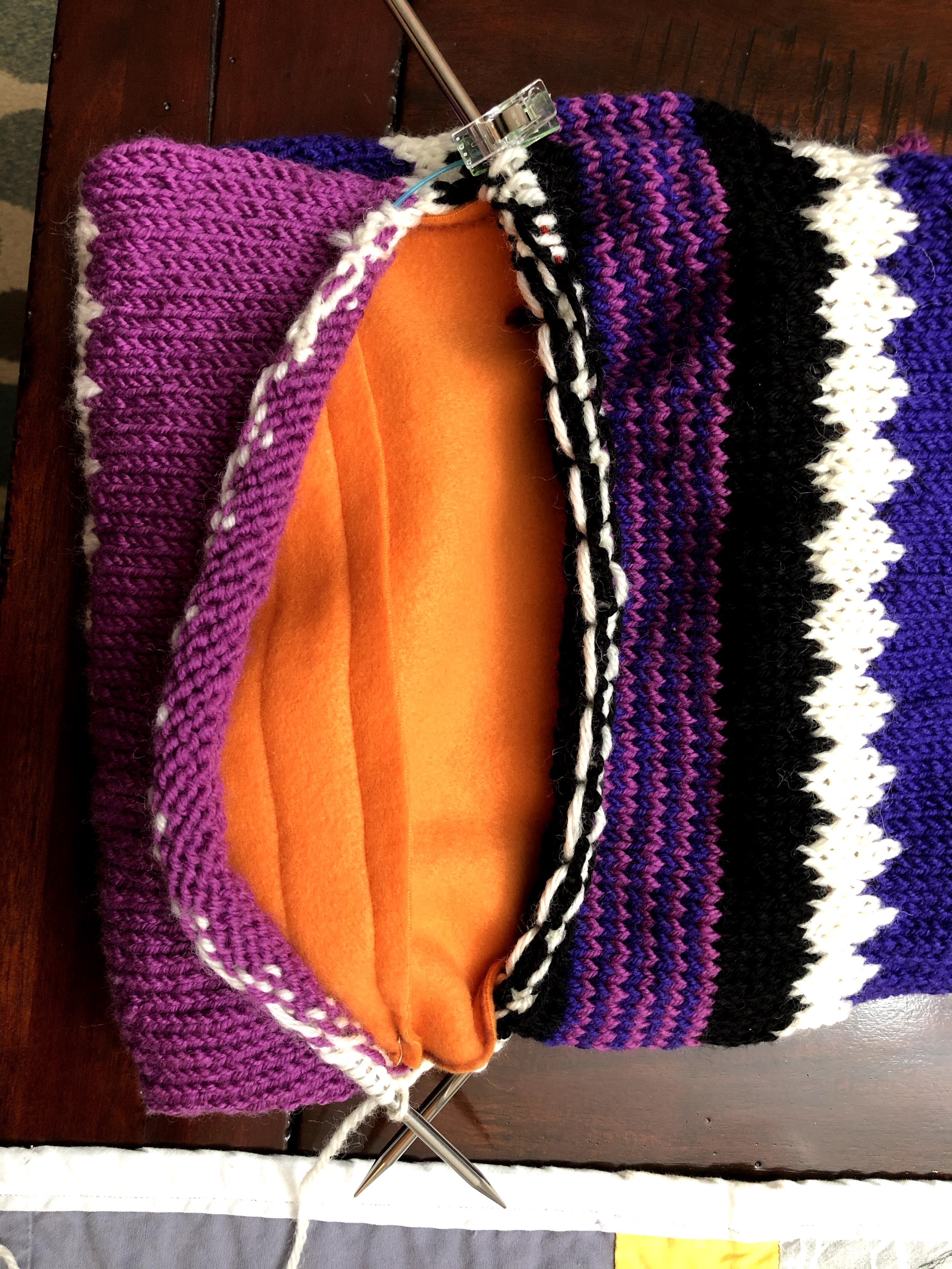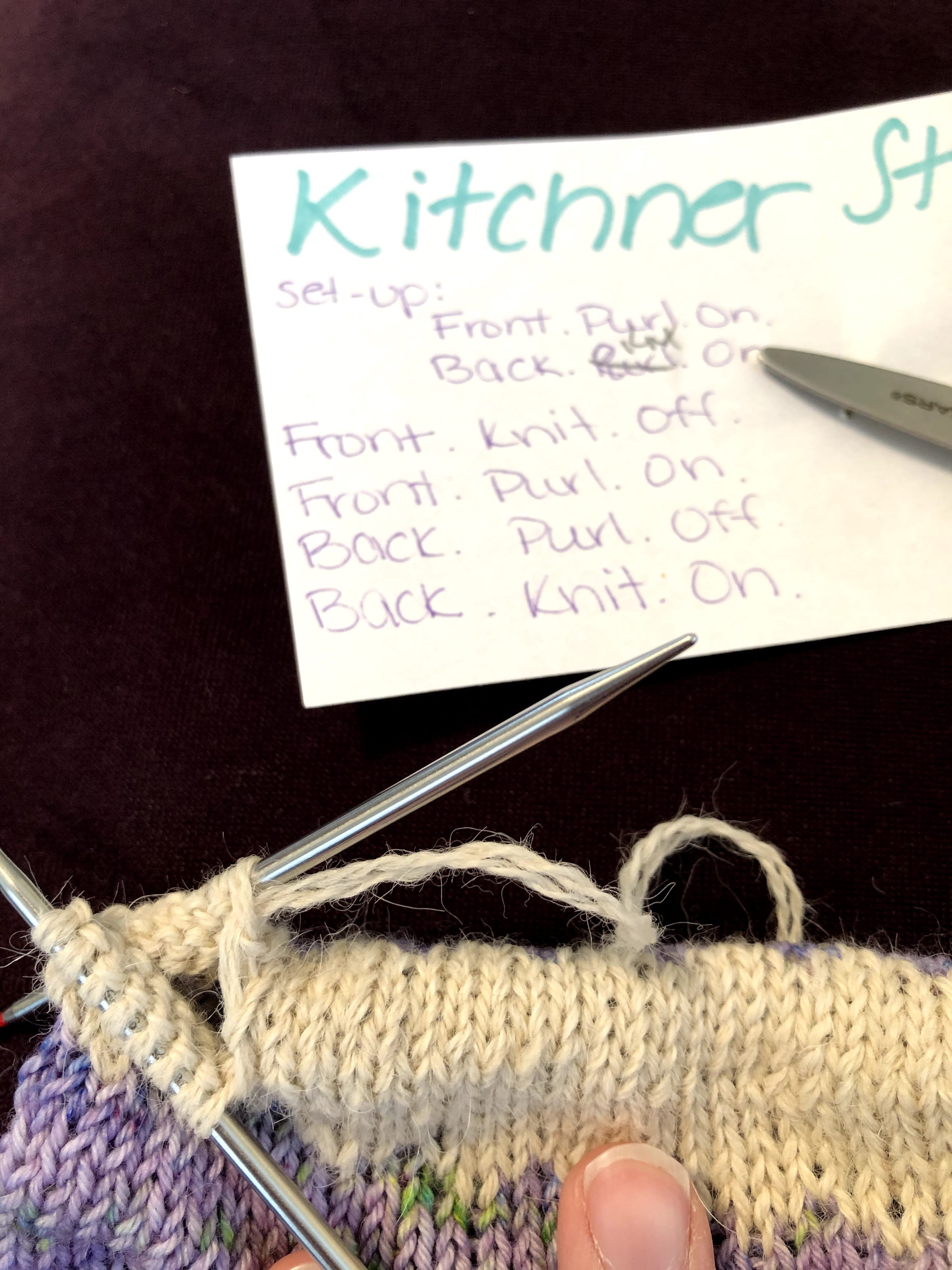 The cowl: I am constructing my sample out of a bunch of stash. I didn’t have enough stash (besides sweater quantities) to make it out of all the same brand. At least it’s all the same fiber content; I used 100% wool. But if you don’t like/use/have/prefer wool, acrylic or cotton would also be adequate. Since I’m adding a LINER to the inside of the tube (for warmth and wind protection), the outer yarn is secondary for warmth. Cotton may be appropriate for the windscreen variety. I thought undoing the provisional and kitchnering the ends together was going to take FOREVER, it was about an hour. So not bad!!