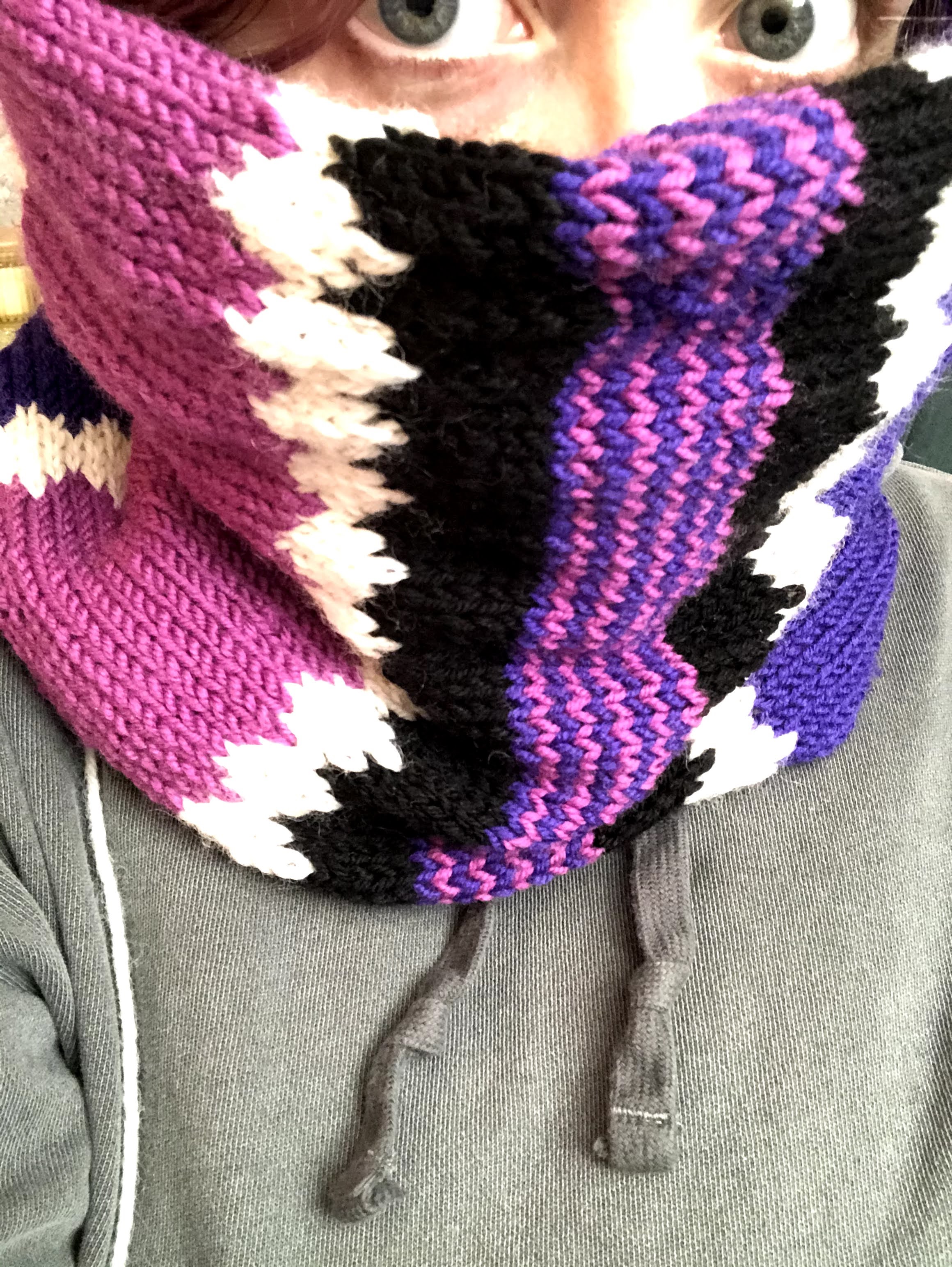 It fits nice and CLOSE and is warm! (before I wove in the final end)