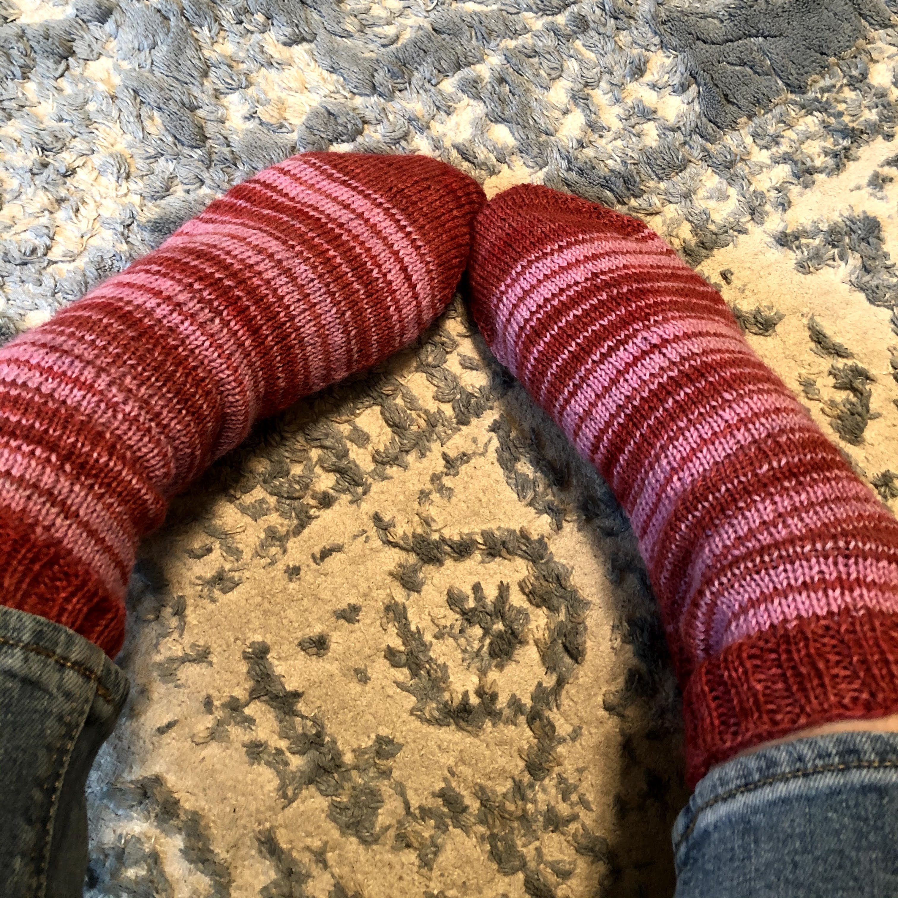 The yarn is some mystery yarn that is a wool/acrylic blend that I purchased off of EBay in 2008 or 2009. I would call it heavy fingering or maybe even sport weight. I work it up on a size 2 with good results. I dyed each of the 8-12 skeins a different color with a variety of Wilton Cake Icing dyes set with white vinegar. For these socks I striped a reddish pink and a light pink. I gave not a lick of care about color jogging. And the gauge is a bit off between the two. The striping SHOULD have been the exact same; the striping is fraternal. Theoretically I have enough yarn to make a reverse pair. I don’t think I will.