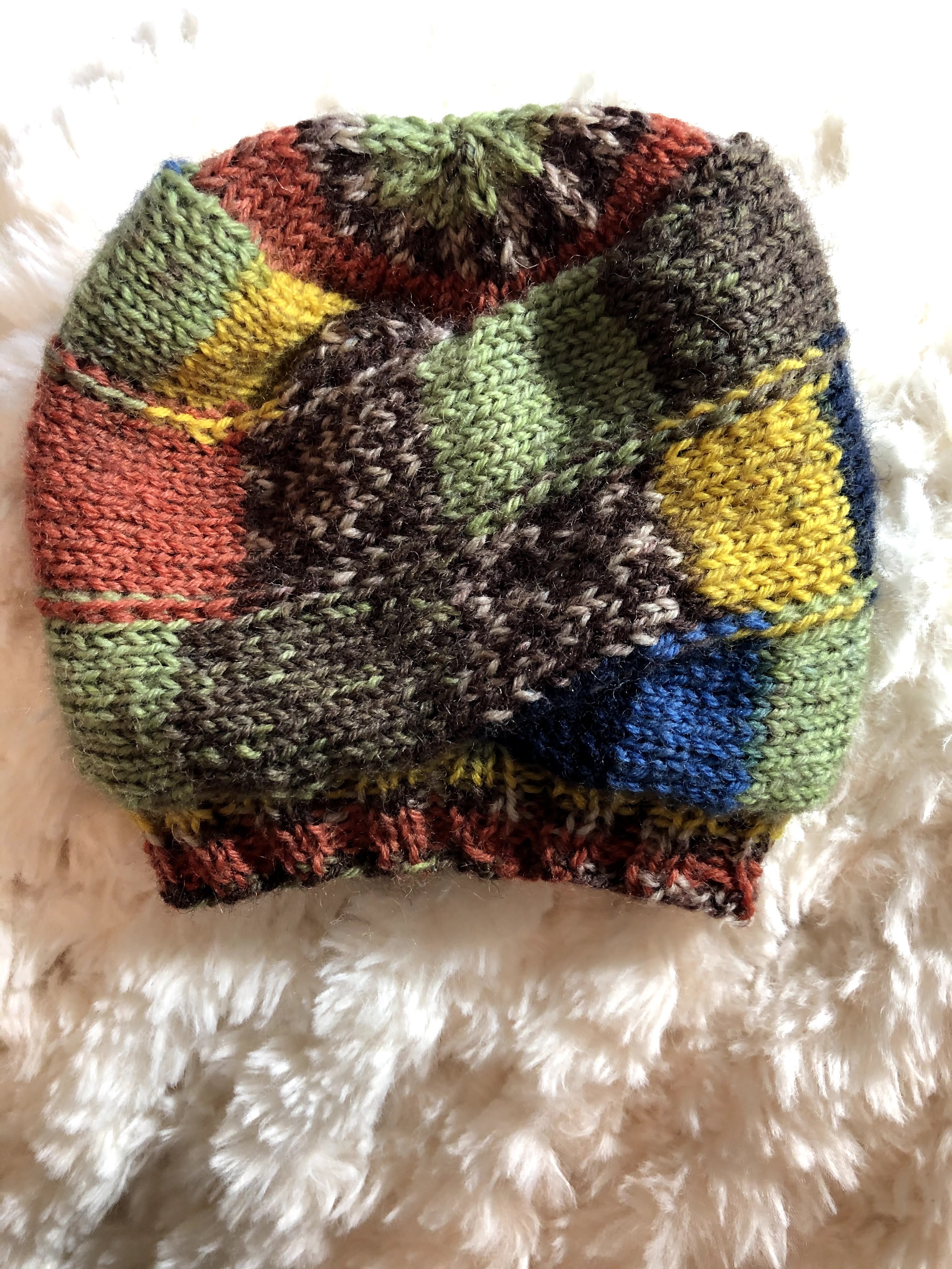 What didn’t work: the yarn. I like this yarn coloration, just not for this project the stacking is meh. I started the increase on the wrong side, so my joins are on the wrong side. The 10-stitch strip may be too wide for a newborn-ish sized hat, maybe its just the weird patterning of the yarn I used.