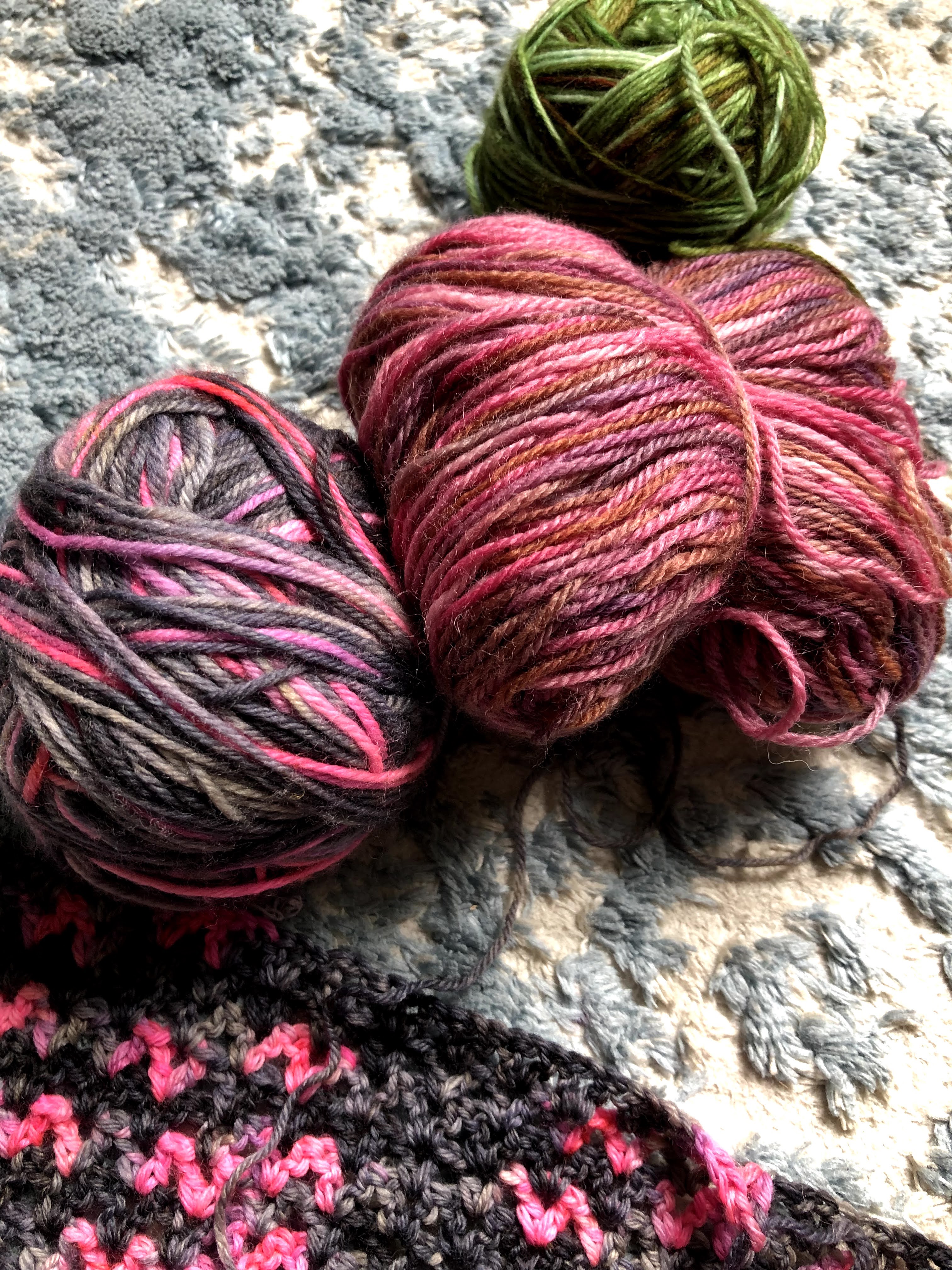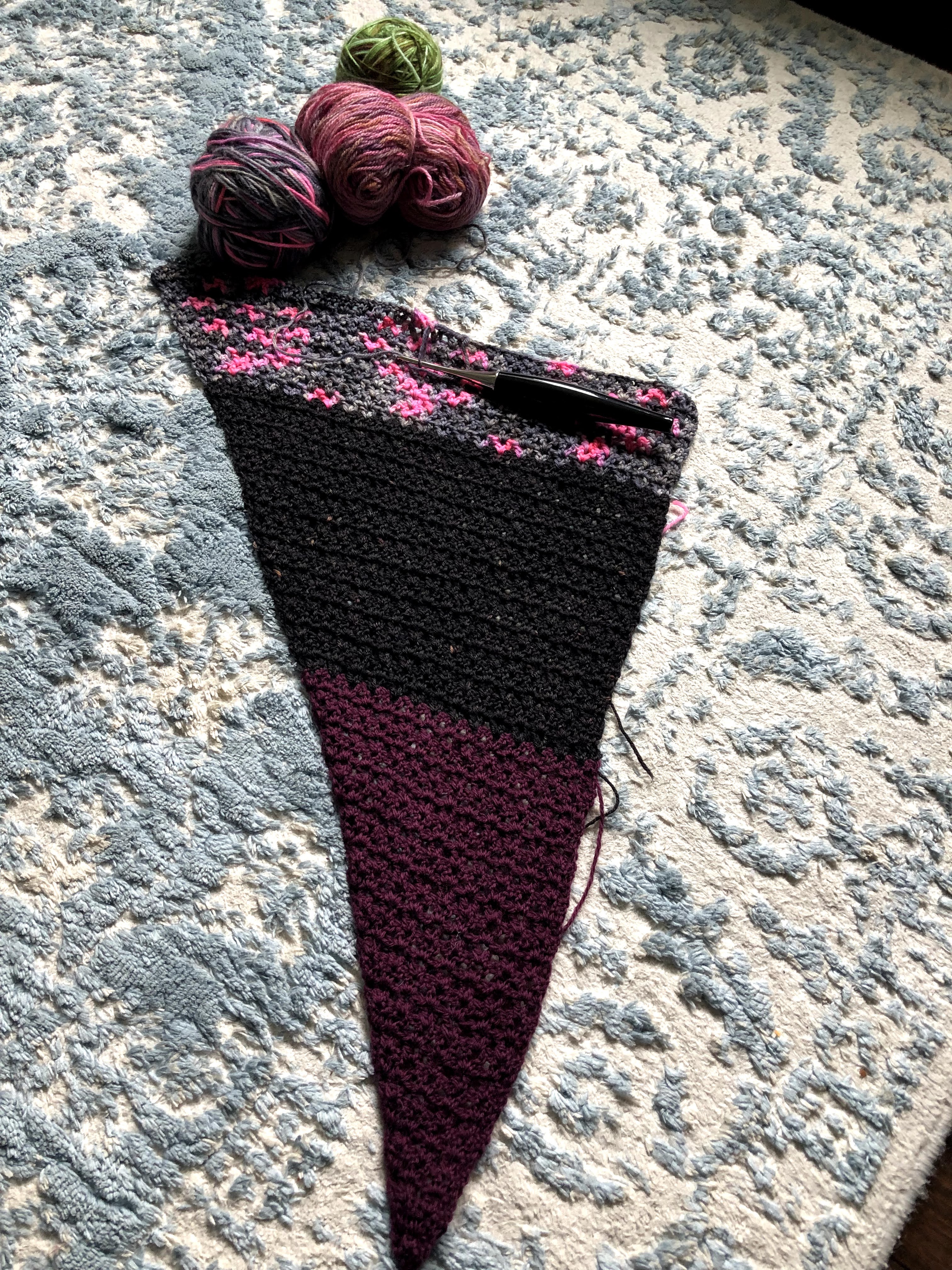 For years, I have stoutly refused to make the same pattern twice. But as the designer, I can make the same pattern repeatedly. What’s that about? The Acute Shawl (Rav link) is no exception to my multiple makes of my own patterns. This one is my 4th, and is different than all the others! Its fingering and worked with stash (like the original) but THIS one is crocheted with smaller quantities to give it a colorblock effect. This will ultimately use AT LEAST 5 partial balls of yarn toward my 2021 goal of 100 balls of stash used. Winning!! I am not entirely certain 5 balls is enough, and may possibly require many additional.