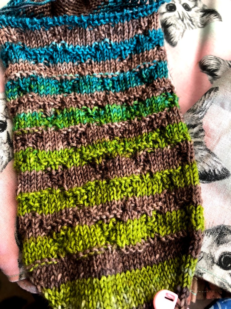 I decided to knit a pair of socks out of the Darn Good Yarn kit I got earlier this summer (I’ll talk about the yarn in the future). I am working a textured stitch called “Dragon Scales” from Oh La Lana. Honestly, I think these have a diamond shape reminiscent of my Say Yes To Pie Socks (Rav link- because that’s only where it is for now), but bigger. Working title: Mother of Dragons Socks. The self-striping is not the best ever choice (the texture gets lost) but I’m 100% going to knit these again in the “leftover” orange from the Say Yes To Pie socks with contrast heels, toes and (possibly) cuffs! But I might make them top down because I want to see if tubular cast-on “fixes” my issue with top-down socks.