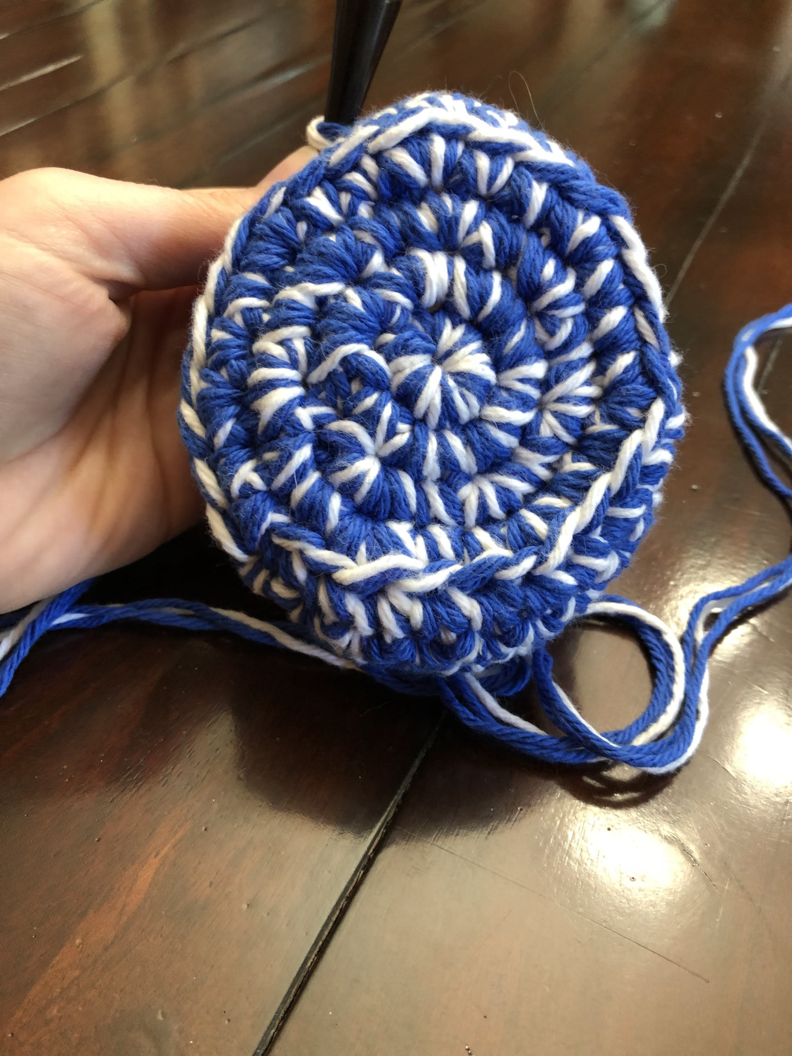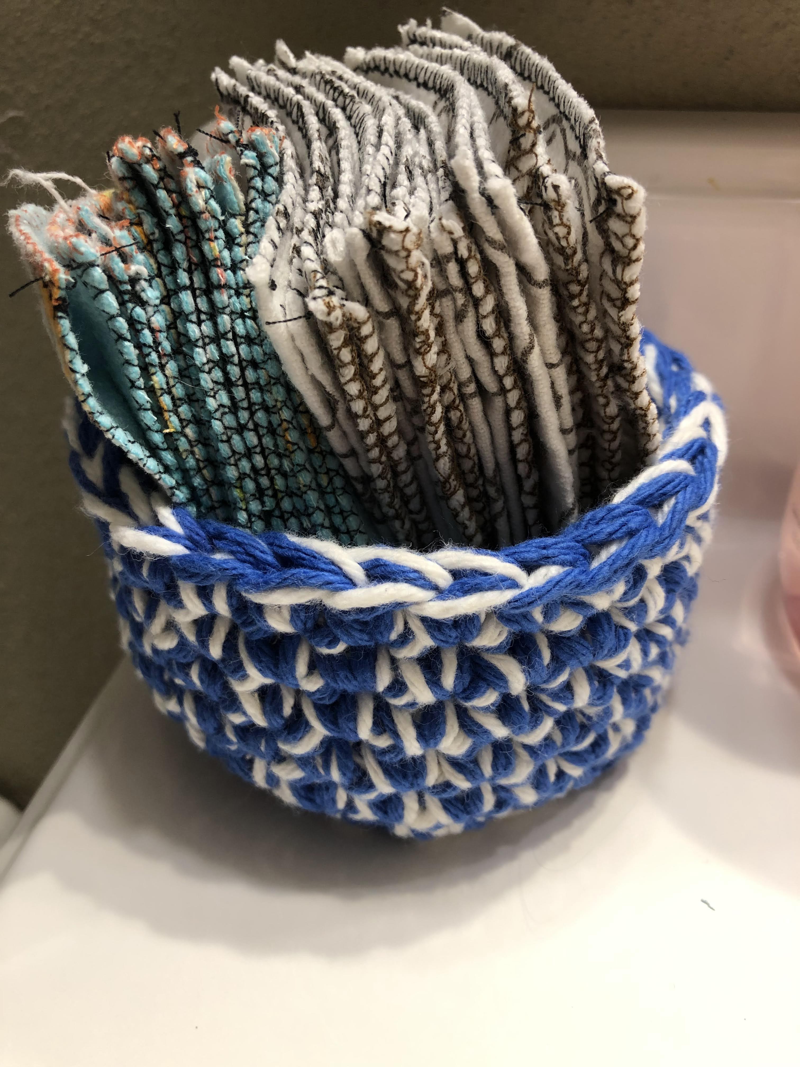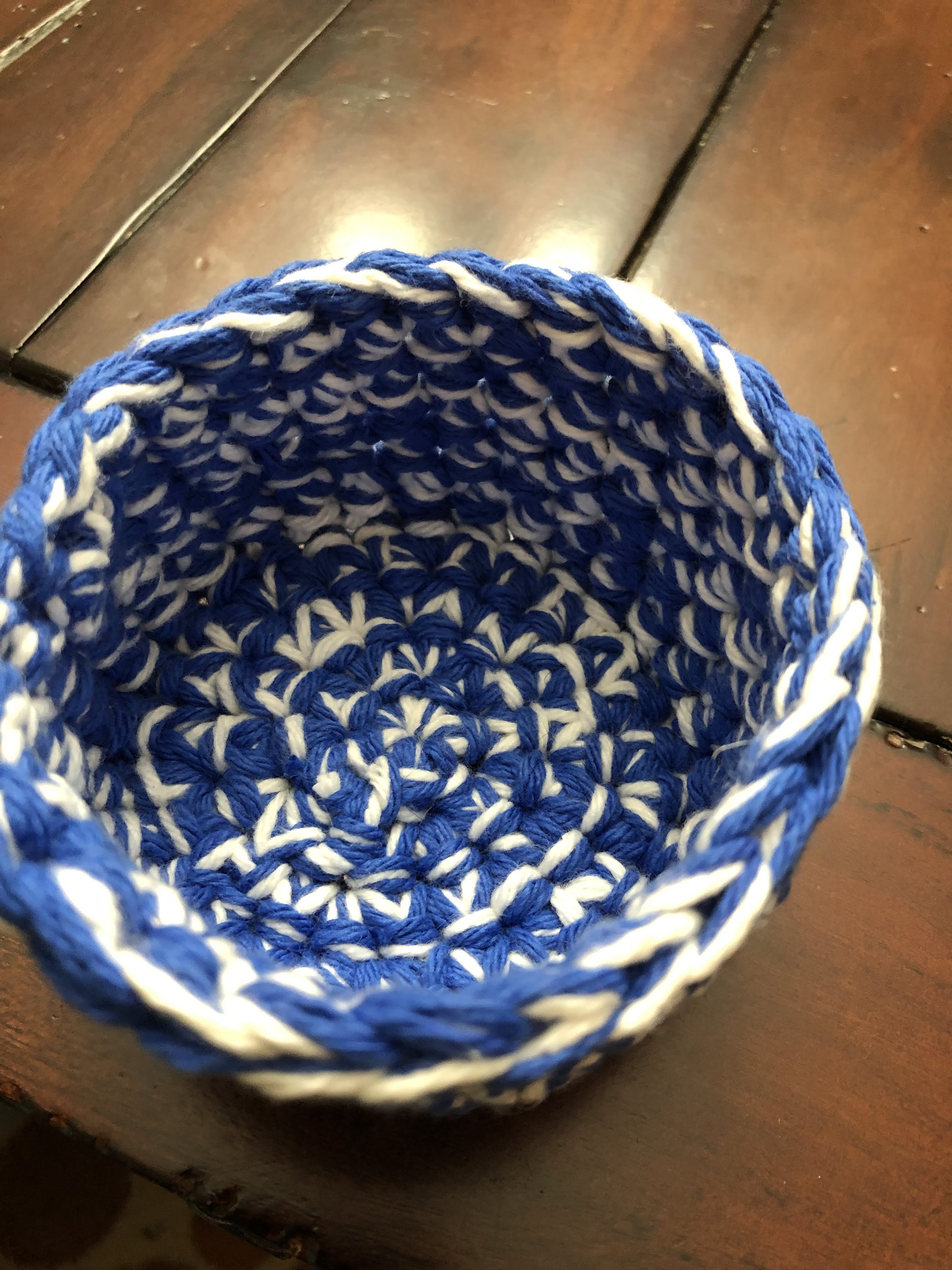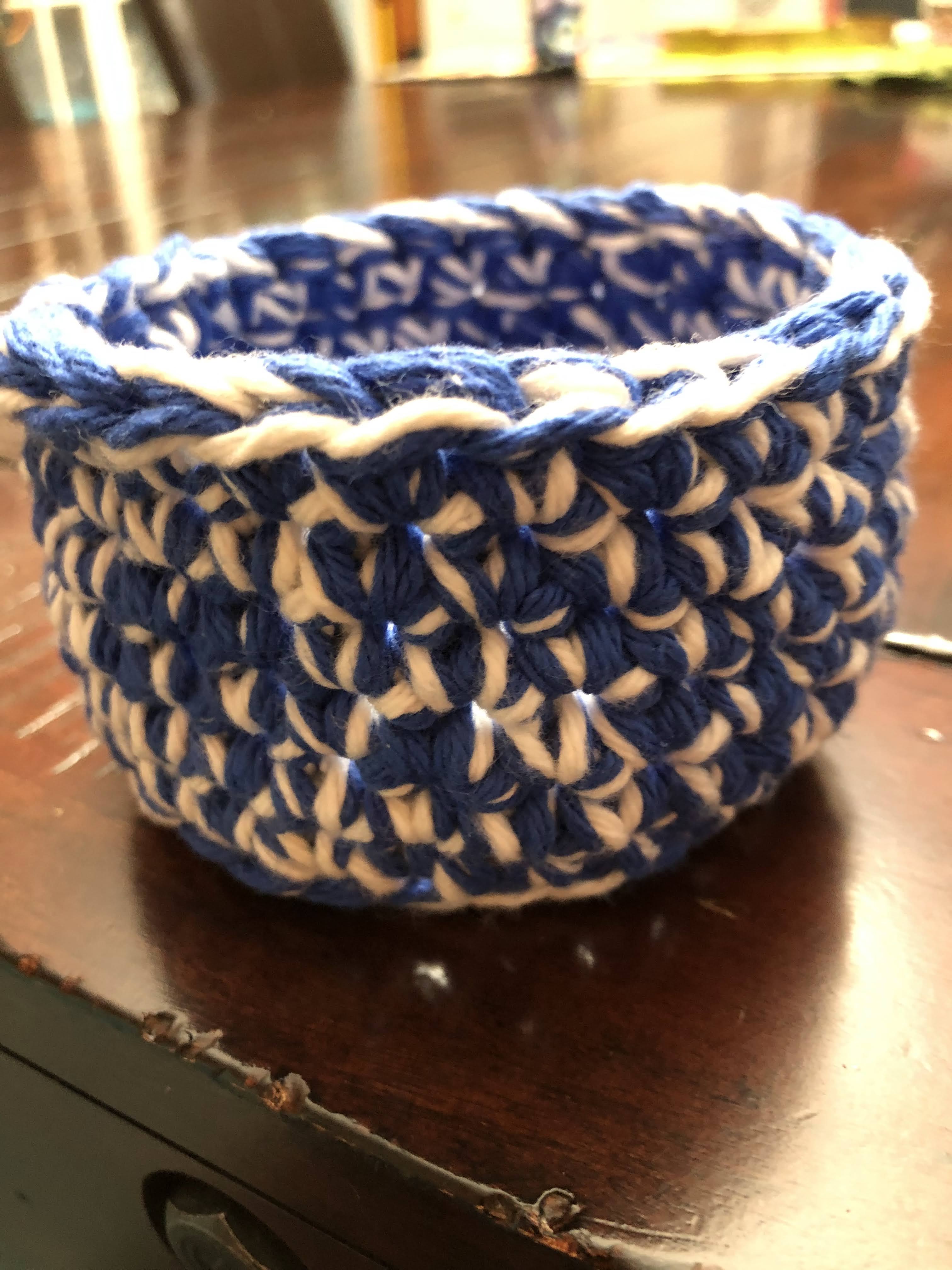 I whipped up a bespoke mini-basket out of 3 strands of dishcloth worsted cotton and a J hook.