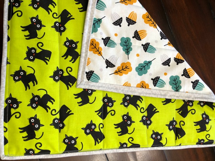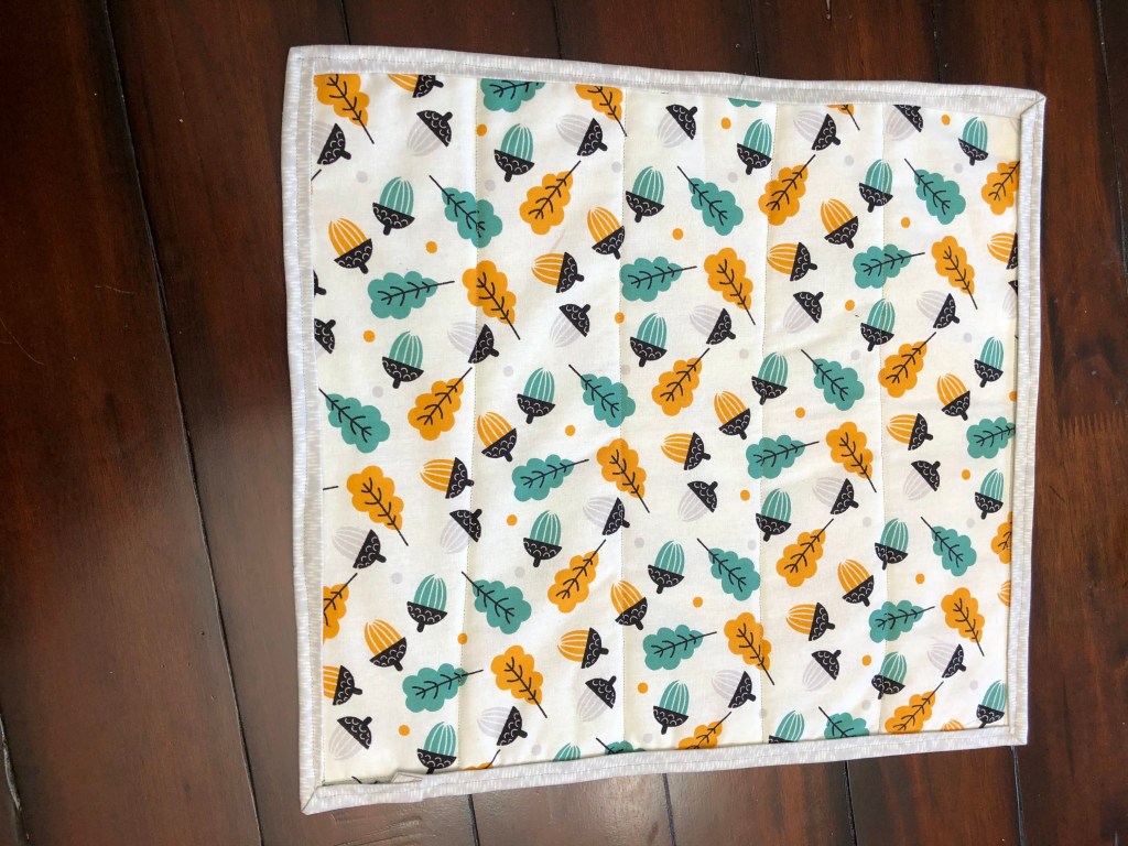 That’s right, I wasn’t done sewing after I made the face wipes. I had some autumn themed fabric and I turned some of it into a table mat for centerpieces and the water pitcher when I’m not using a table runner. A quick, straight, but freehanded quilt. Its reversible, if you don’t inspect my binding too closely.