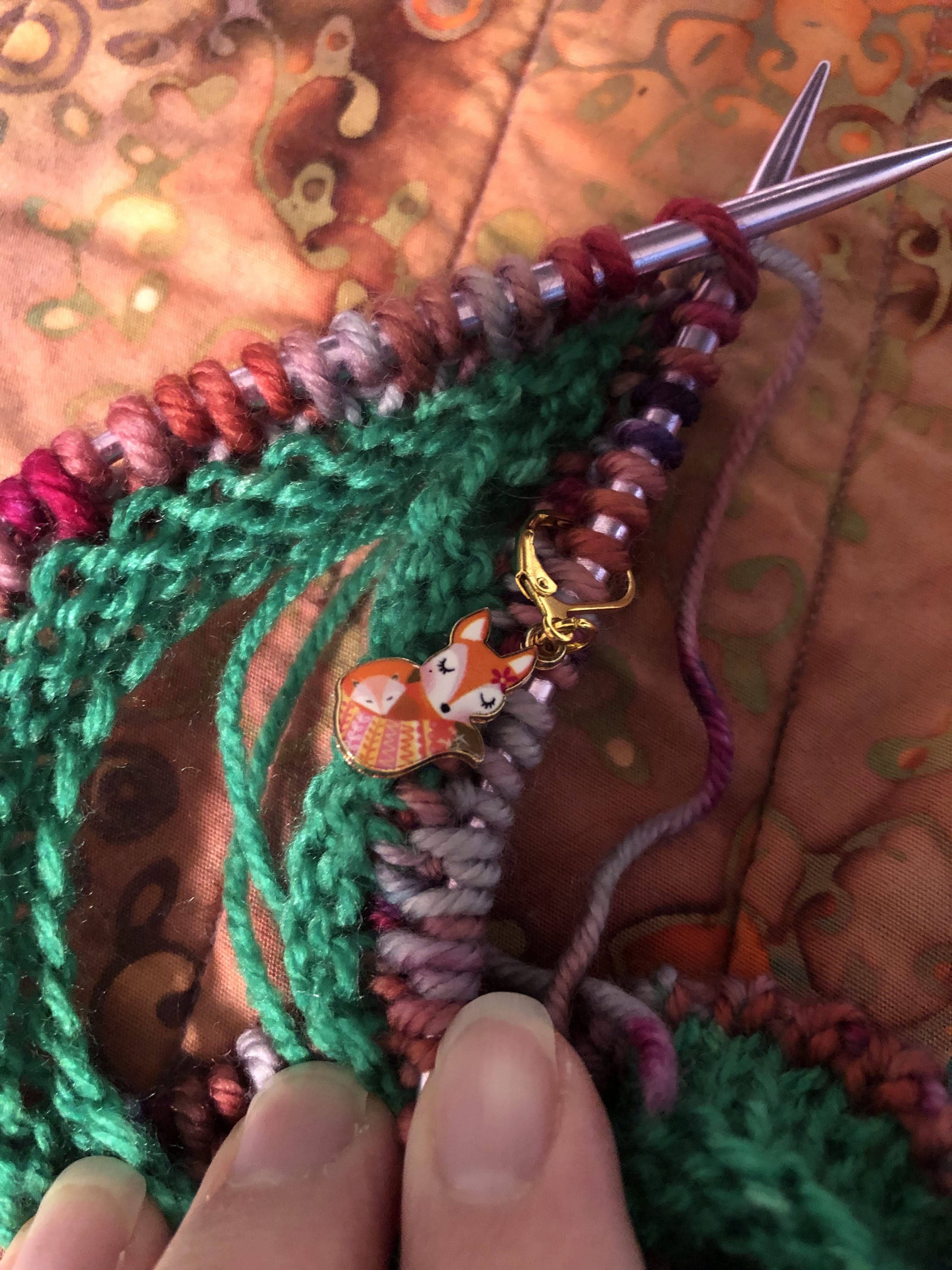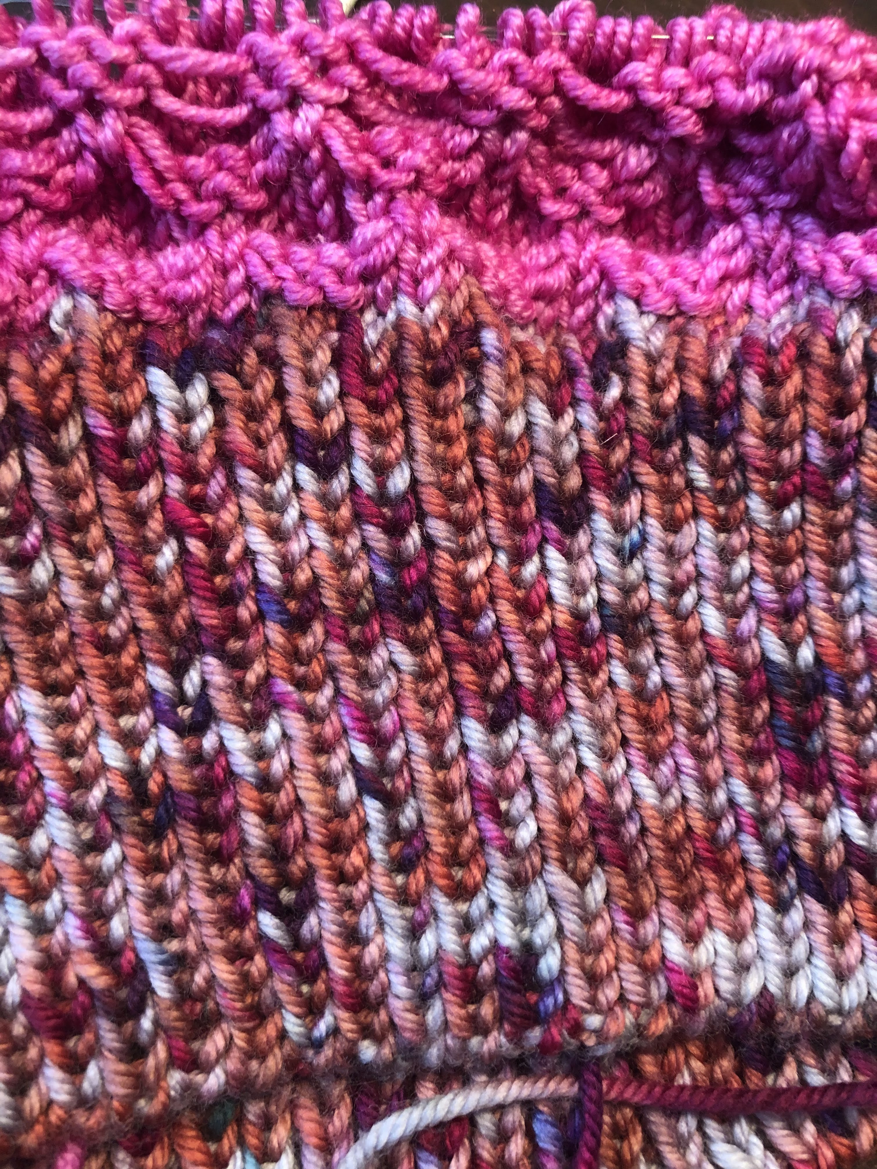 I modified a stitch pattern called aster. I got 1.5 repeats into the body of the hat when I saw it. Between the colors and the stitch itself, it looks like cat butts (if you squint). You may think that they look like flowers, and in another color they very well could. However, with this particular combination, all I see is a field of cat butts. So I ripped back to the ribbing. I might try again in other less fleshy colors in the future. Like blue. Or green. It has potential- just not right now. Also, my daughter told me she hates the way the peachy color looks. After giving me the go-ahead. Kids. AmIRight??