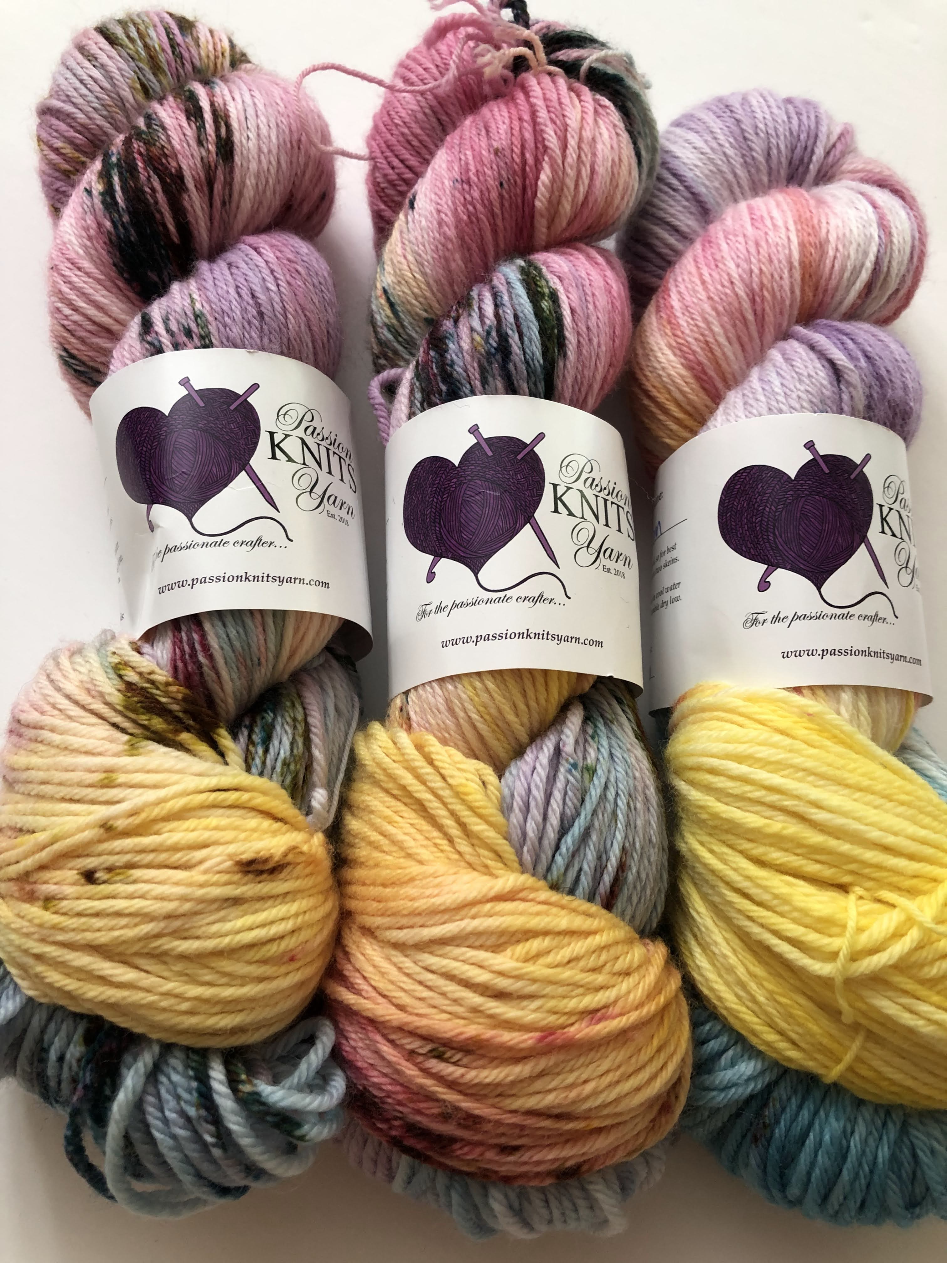 First purchase of the day! Three skeins of DK weight yarn from Passion Knits Yarn! All three are the colorway Peablossom. Two are virtually identical, the third took up the dyes a little different, a different position in the dye tray.