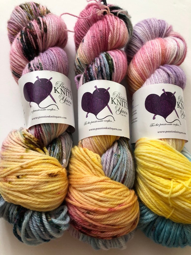 I have some loose ideas for a sweater (our of the DK), socks (the sock kit), and a shawl with the 2 skeins of 100%wool fingering. My winter has a LOT of projects…. I need to learn to knit faster!