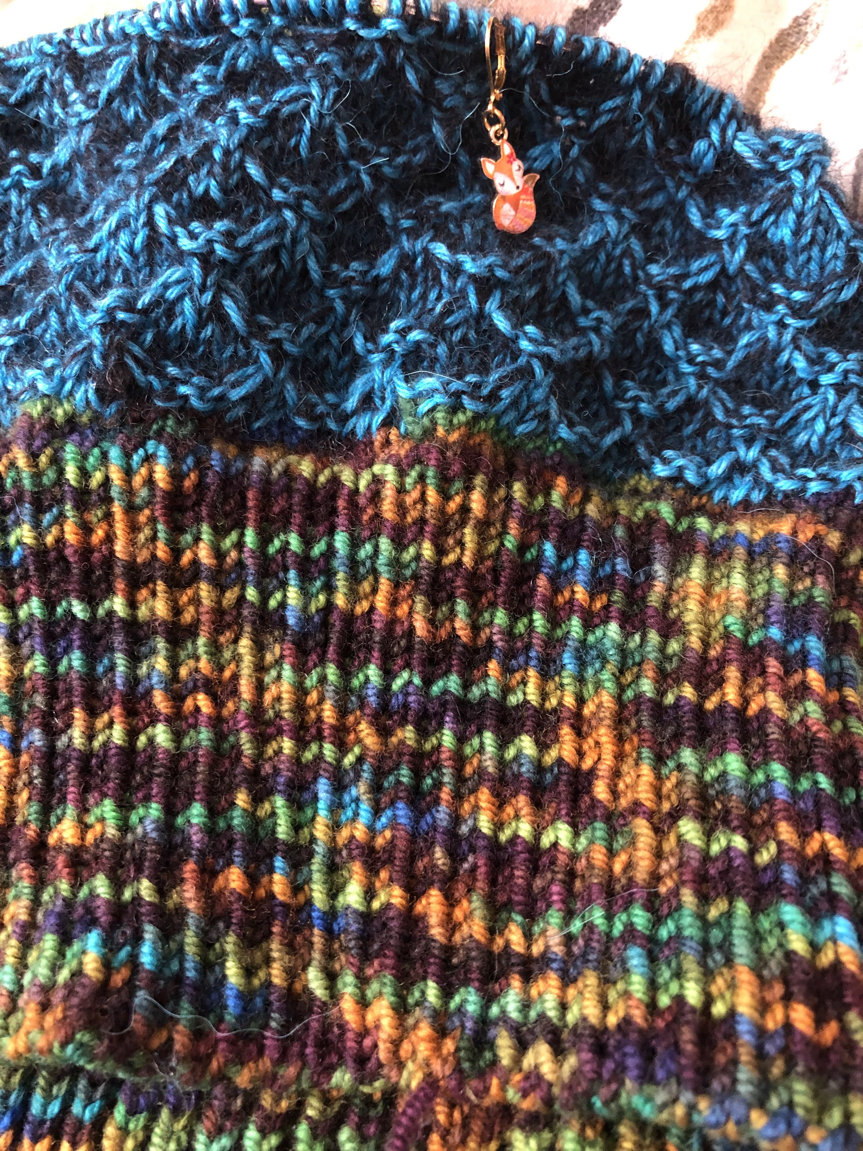 I have decided the black kid-silk and the alpaca mystery yarns look good together and coordinate ok with the variegated brim. I am not 3 pattern repeats into the body of the hat. I intend to work 6 pattern repeats before I start the gathered crown. I will reevaluate to see if I want a longer, more absurd hat. Because winter is dreary- and being fun weird is a reprieve from all the drabness.