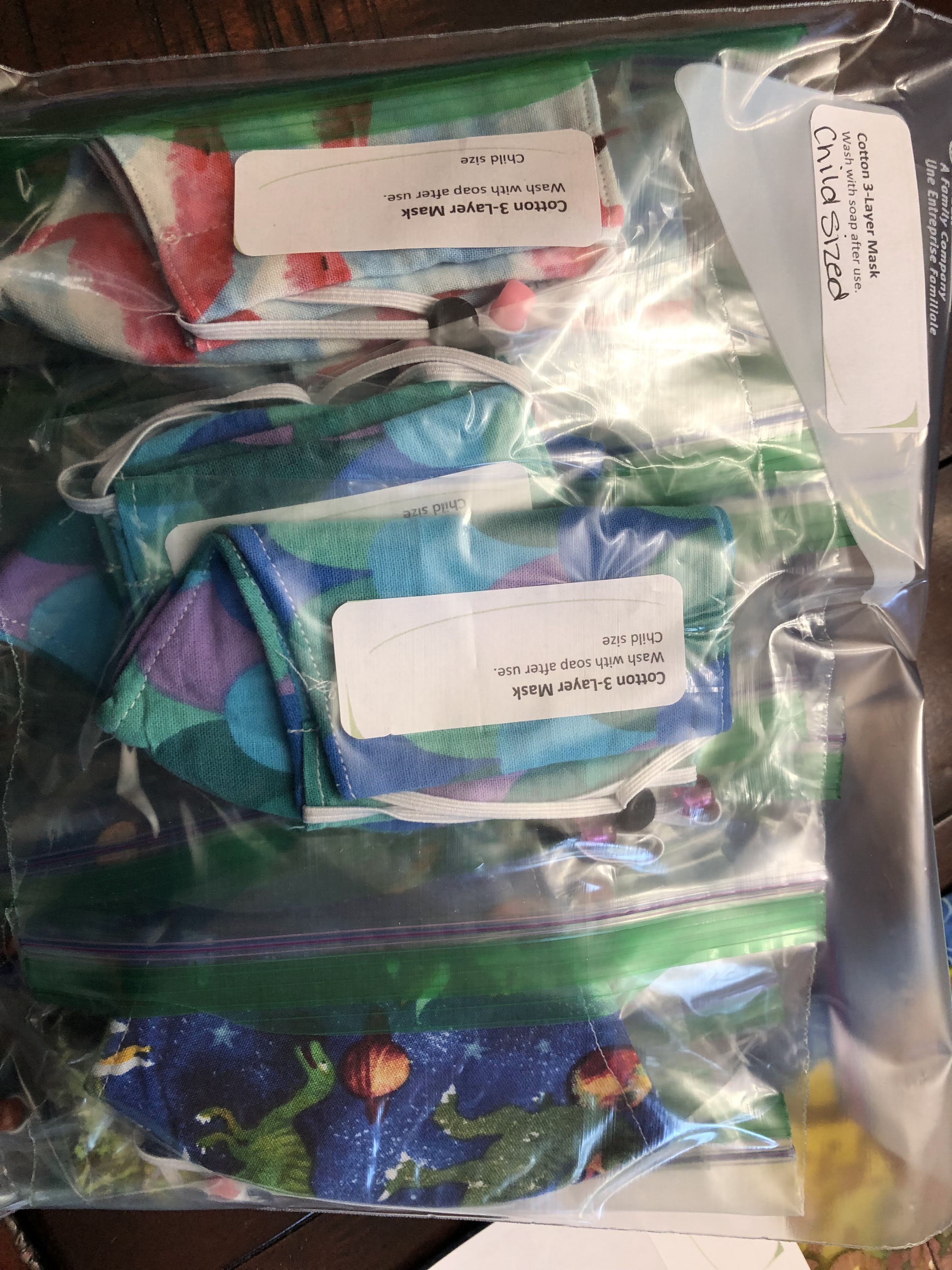 Masks. I made 17 or 18 kid sized cotton masks for my kids’ school. Nothing fancy, just dinosaurs and mermaids and flamingos. Stuff that was fun and the print sized appropriately for masks (a LOT of my prints are way too big for mask making).