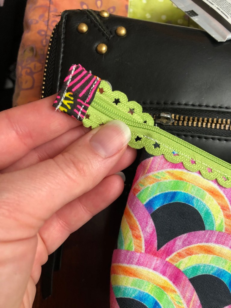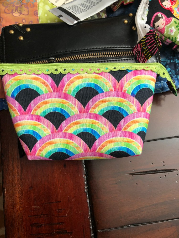 With this pouch, I sewed the whole body together first, and then the zipper on last. My zipper pull ends are getting better, they don’t look so….. haphazard. Using a dark thread and unpatterned dark fabric would have made them look better. Details. Its good enough to gift, and has a SUPER COOL zipper to boot.
