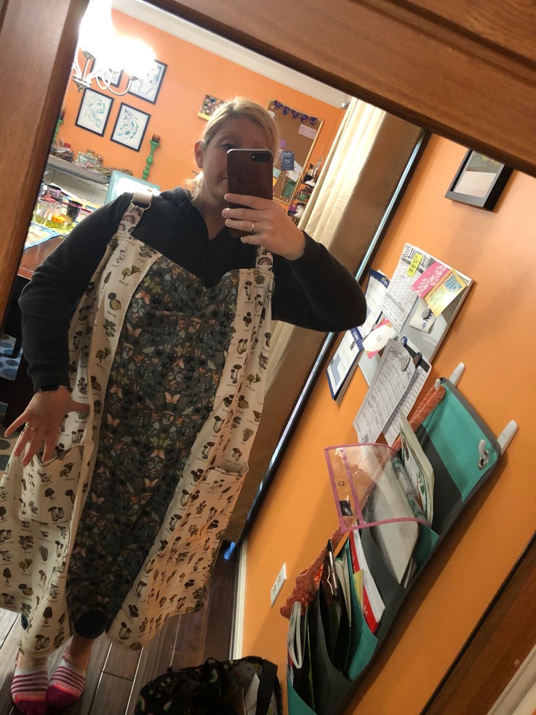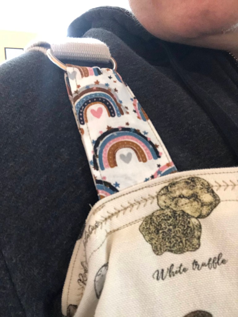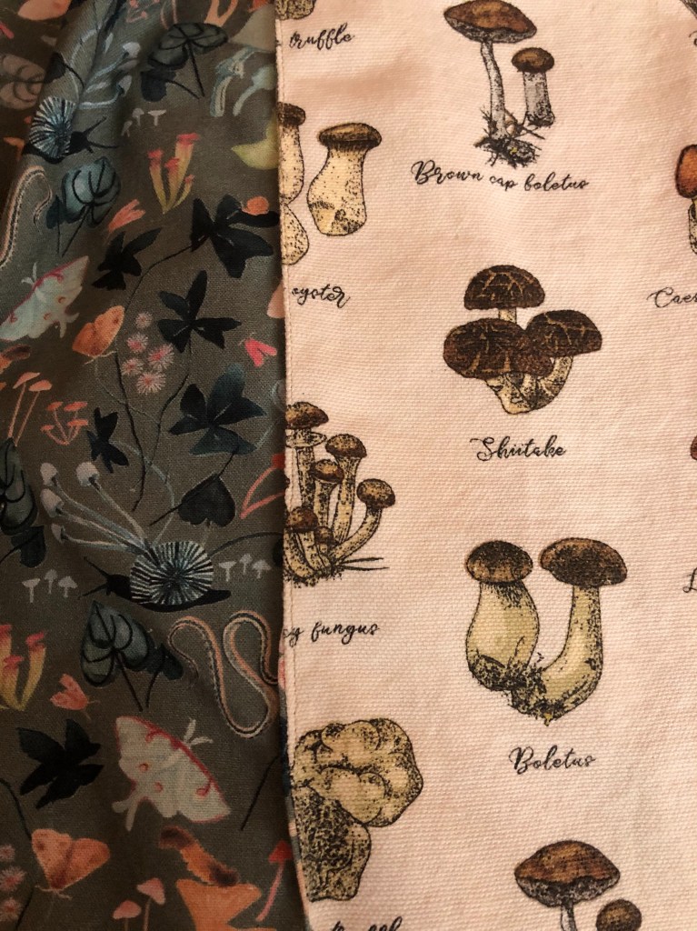 It started off as a simple rectangular apron with pockets and straps. But I needed to make the piece wider than the width of the fabric. I then decided to stripe it, do what amounts to a reverse french seam (does it have a real name??), make adjustable straps, and fancy decorative stitching. The fabric is all from Joann. The “scientific mushroom print” is a light canvas. The green mushroom+ print is a “premium” quilting fabric, and the rainbows are “keepsake” quilting fabric. I used ALL of the canvas and have a 12″x45″ strip of the other left. I still have most of a quarter yard of the rainbows (and plans for another week)