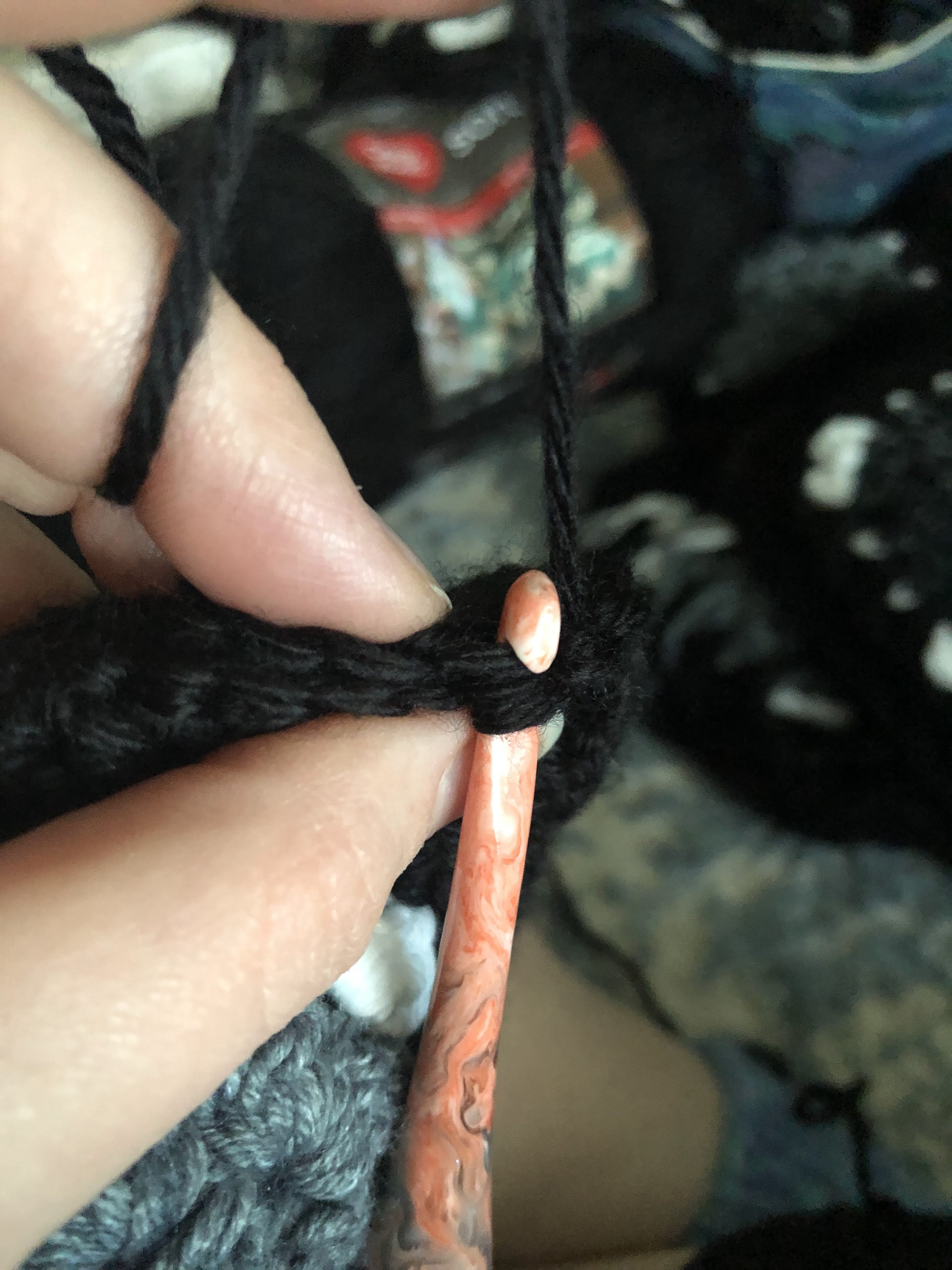 Doing any craft with black yarn is not for sissies. How wonderful that your daughter wants to learn to crochet. My daughter did too. She could do a chain miles long but never could figure out how to turn it and crochet back the other way to make an actual fabric. (Sigh) Oh well………..it was some good mother daughter time.