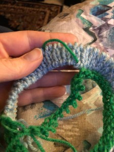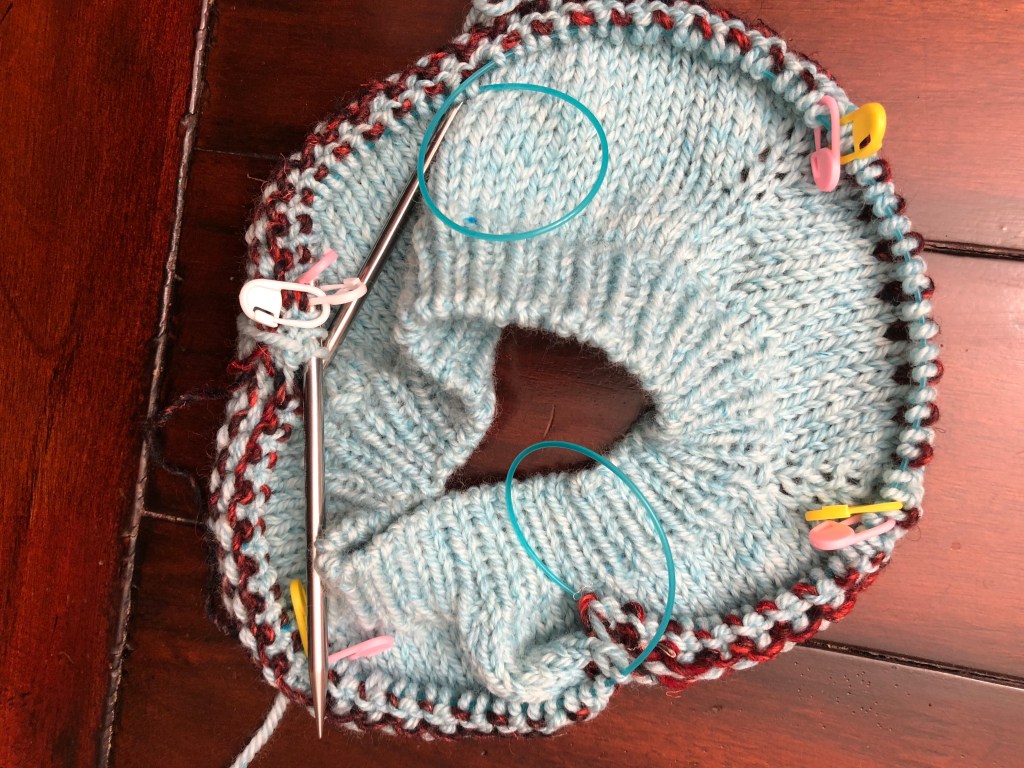 All the yarn is deep stash. The blue is Shepherd’s Wool that I purchased a decade ago to make a sweater I never made. I have 5 skeins of this, BUT at least 2 different very close colors. If I recall, I have 3. But there is no telling for absolute certain, because I have LOST 4/5 ball bands since winding them (also 10 years ago). From memory it’s Lt. blue, Lt. turquoise, and Misty Blue (that’s the ball band I have). In the light of day maybe I can figure it out. The contrast is Noro Silk Garden, and is leftover from my Stained Glass Sally Cardigan. I have 2 skeins of this.