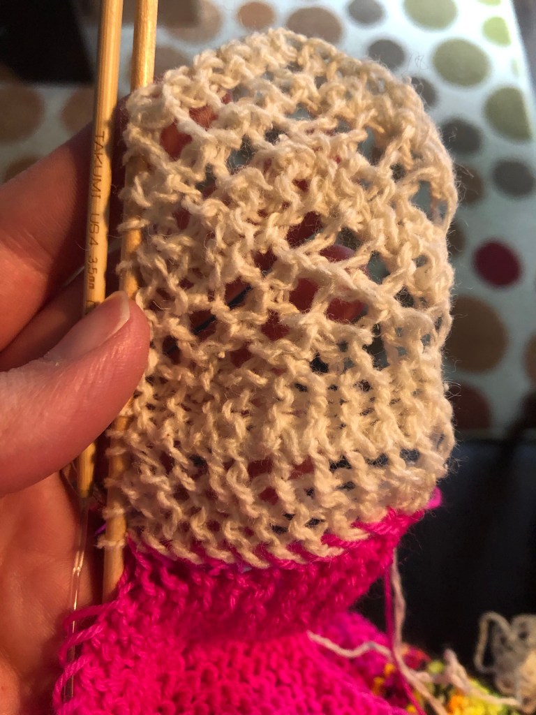 Back in November I started a fingering weight scarf. Short Shawl?? Anyway, after 6 weeks I finished the body. I spent HOURS trying to find the RIGHT border. Today I found โthe oneโ, cast-on, and am 3 repeats in. Only 35 or so more to go. I opted for a stash yarn. Ella Rae Rustic Lace (I thatโs the name) is 2-ply wool silk blend. Itโs very grippy and is already beautiful without blocking. The picture color is inaccurate: itโs cream not pale yellow.