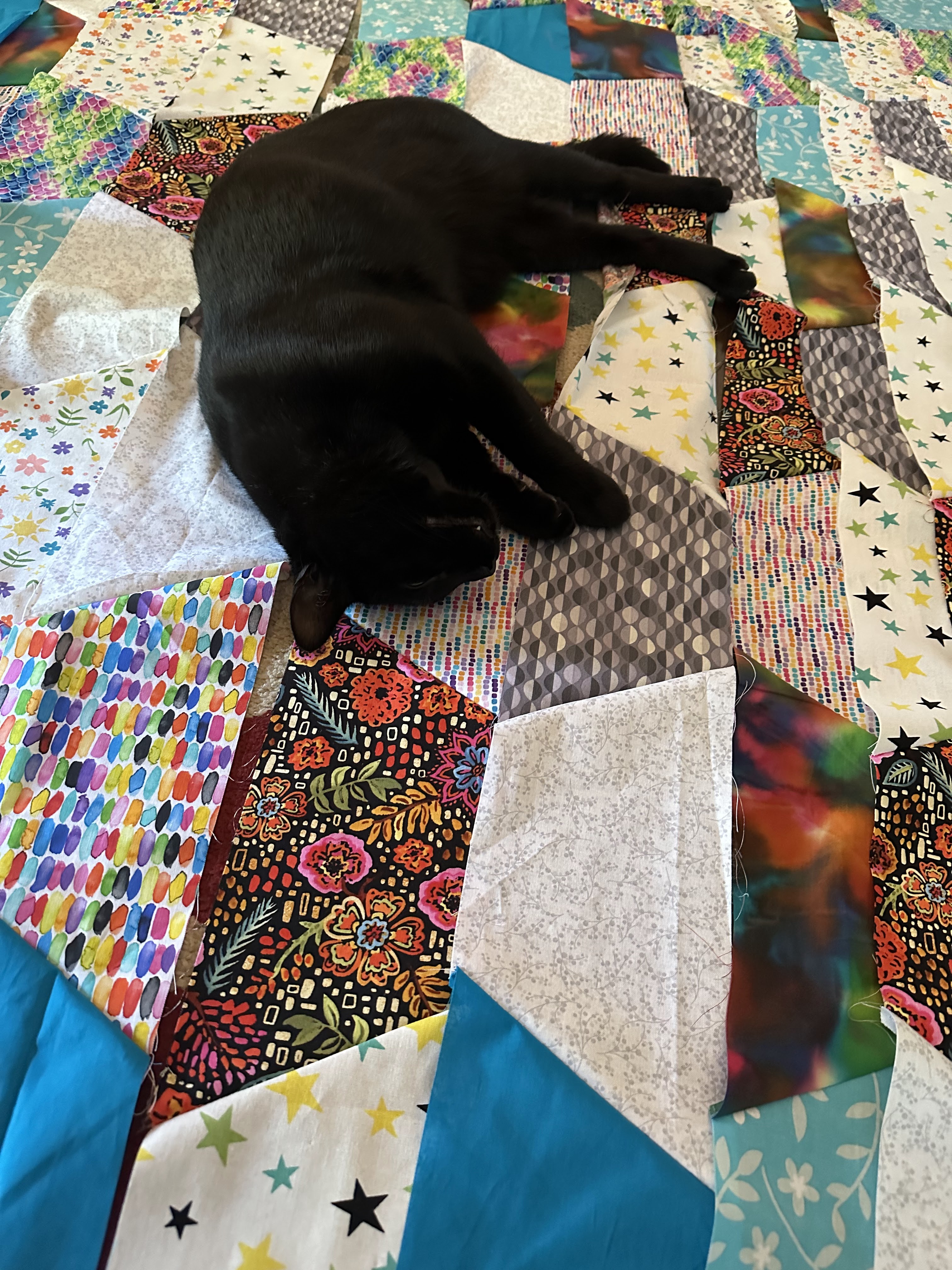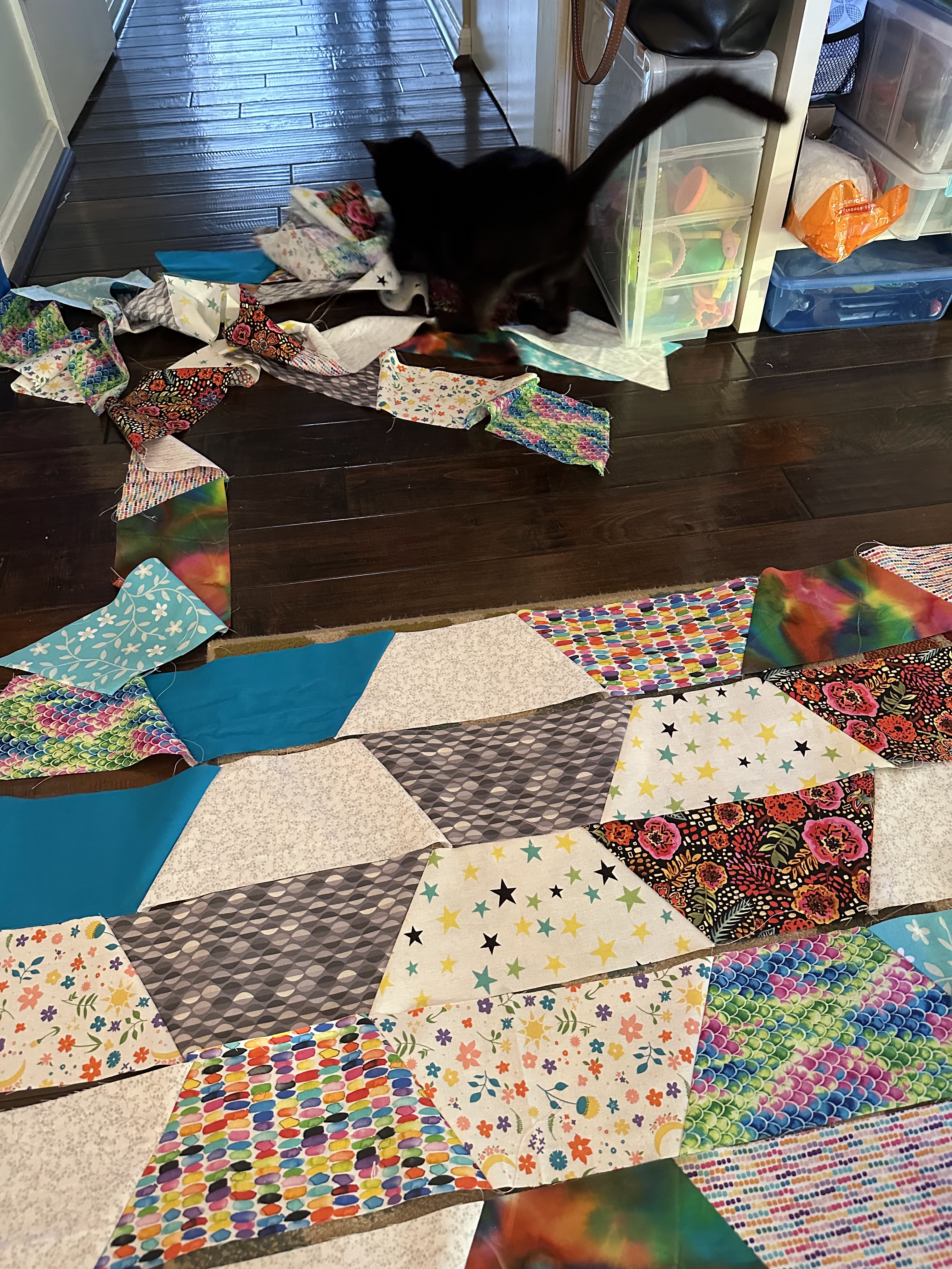 This morning I laid out my strips. Telly helped. Those cotton strips were IRRESISTABLE! He made a huge jumble. Then I laid out the strips again. And again- for good measure. Today was my 2nd least favorite part: the pressing open of the seams. Frijoles. It takes as long as the sewing! Then I managed to sew some of my strips together in not they way I intended to. So I have like patterns abutting now. But I don’t mind. That much.