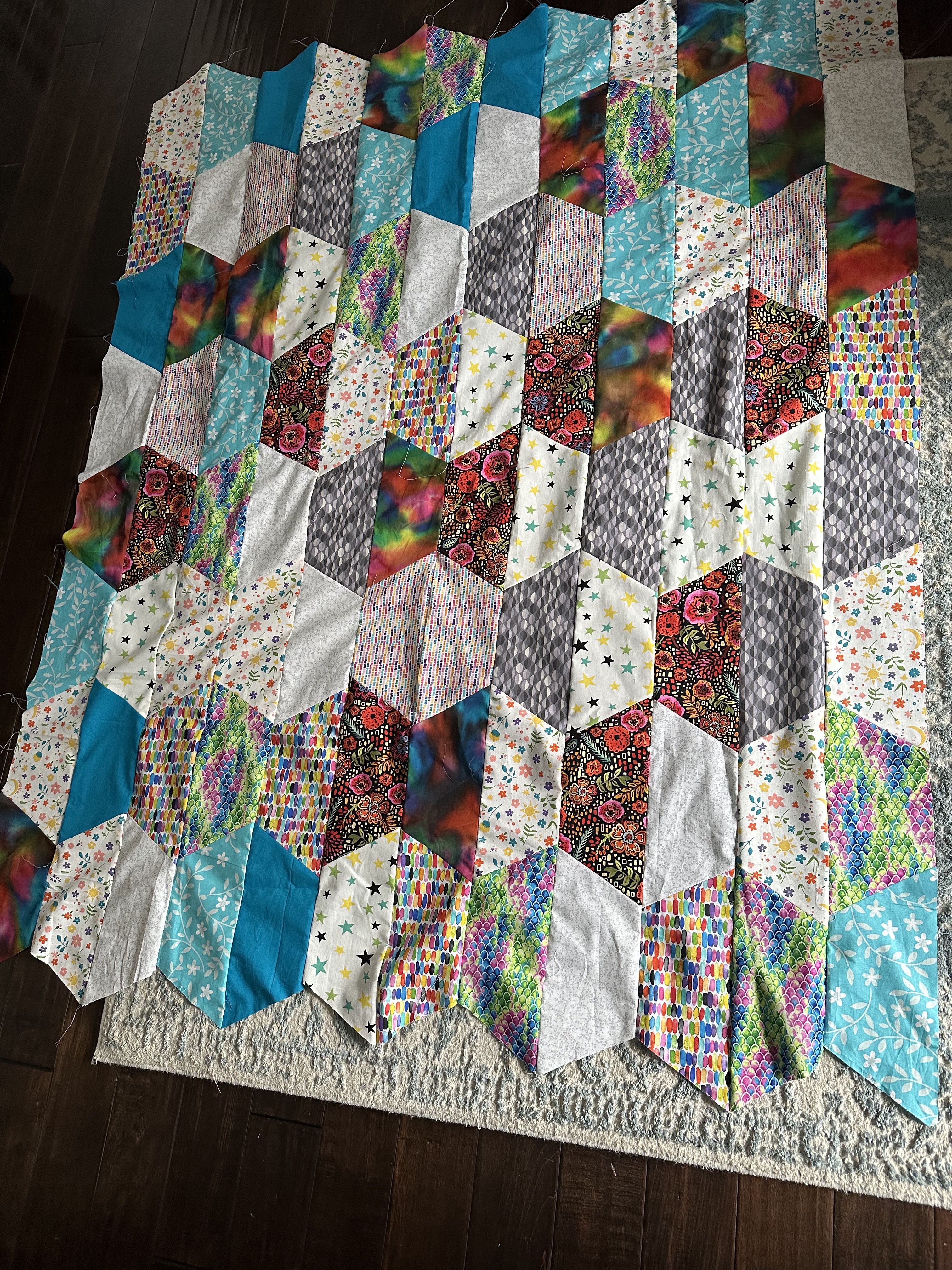 My least favorite part about sewing is cutting. Quilting is A LOT of cutting. This is the reason I haven’t done much quilting beyond my two rudimentary quilts and a few table runners. The Cricut Maker cuts fabric. And there are two free ready-to-make patterns in the Cricut database. I opted to try the slightly spicier of the two, the “half-hexi” quilt.