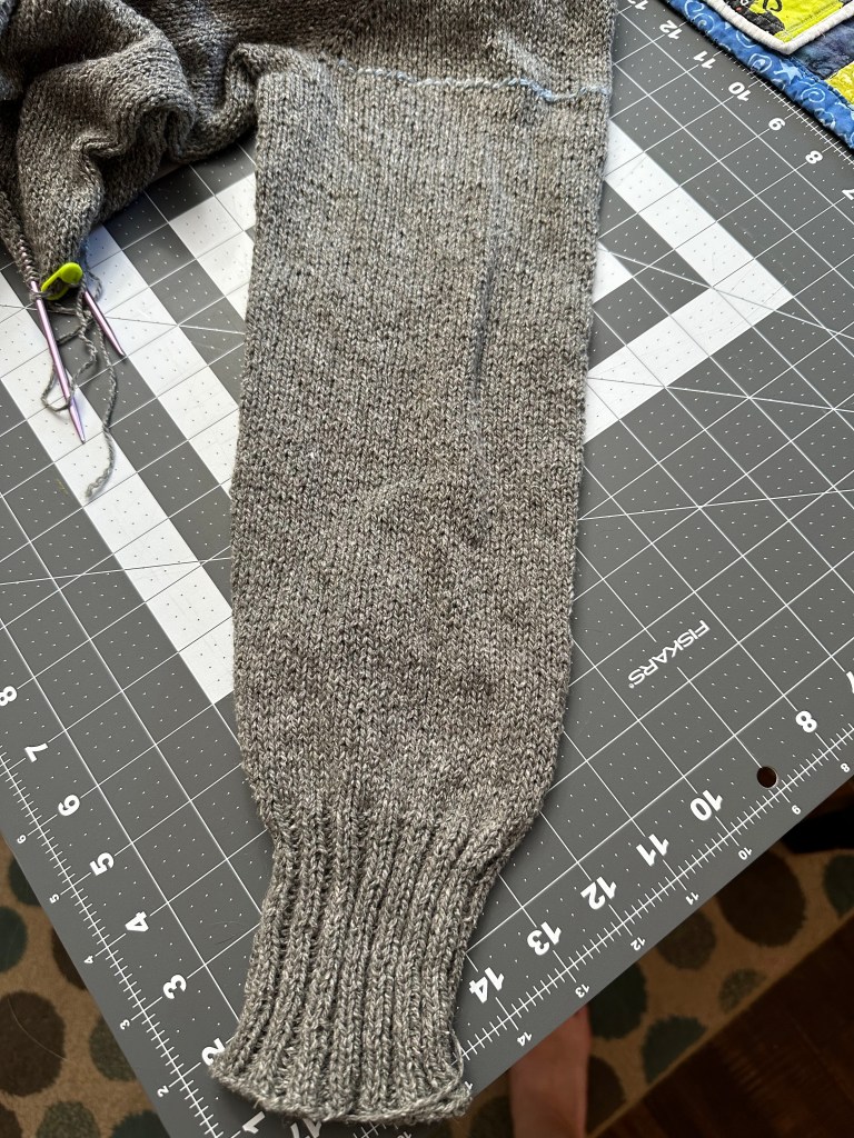 I have 2 full balls remaining. This means I have PLENTY of yarn to finish! Each sleeve takes 9/10ths of a ball. I have a full ball remaining to finish the body. I think a split hem could be nice, with a cable making up the split edges to echo the neckline. I think 2 weeks is reasonable to complete.