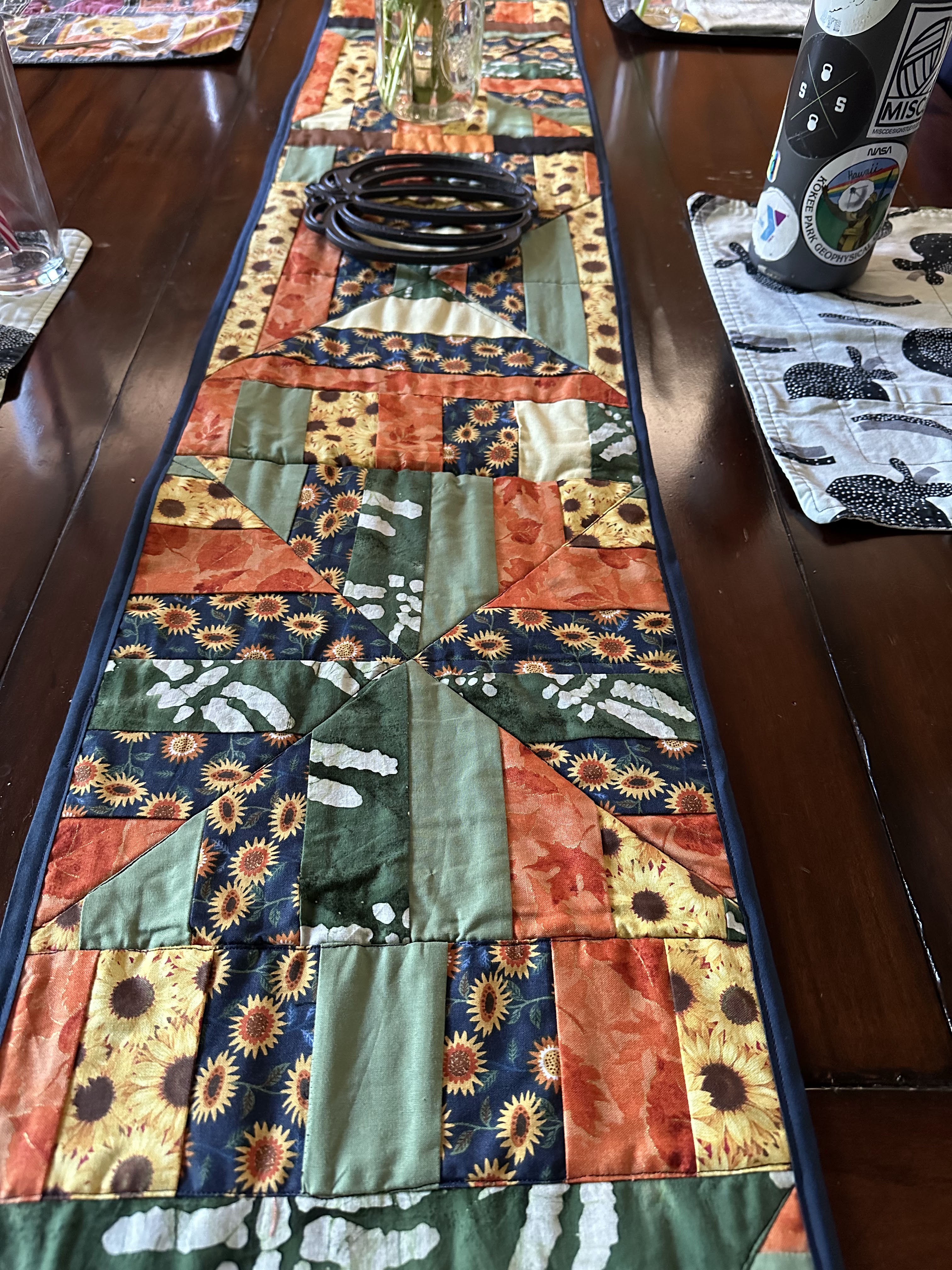 A description of my fall photo dump: I quilted a table runner out of delightful remnants I found. Its backed in fleece instead of the traditional batting and back fabric. My family likes the skull and mushroom fleece side.