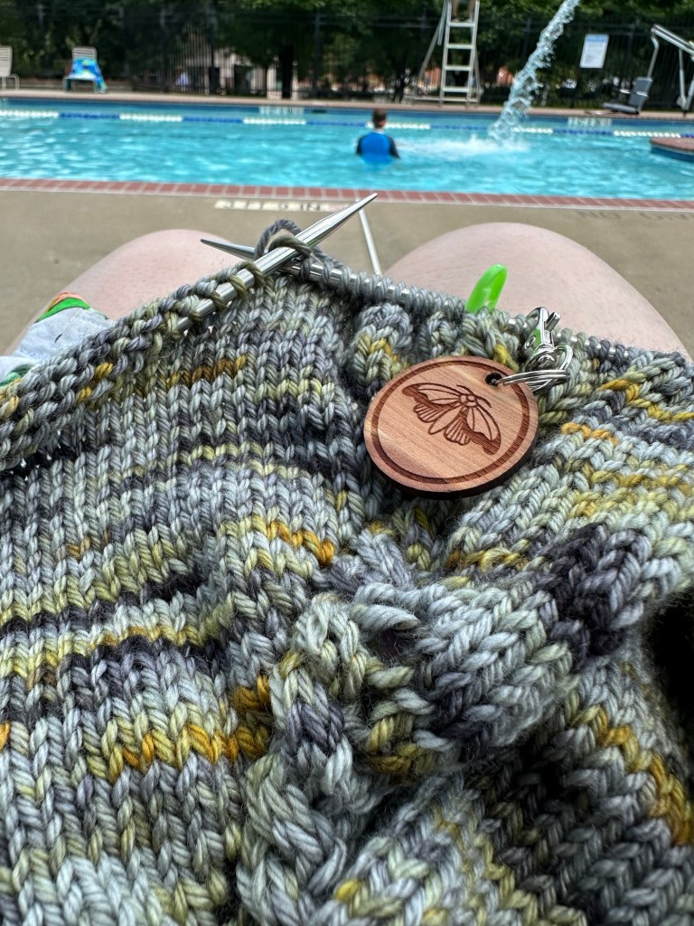 1. Ah, yes, Trying to knit in the humidity of summer with wool. I haven’t knit outside as much as I thought I would because it’s too hot and humid to be outside! Fingers crossed this week will be a little cooler so I can knit outside in the mornings. I like the colors of the yarn you are using for your sweater. My son is enjoying his last month before school starts up again.