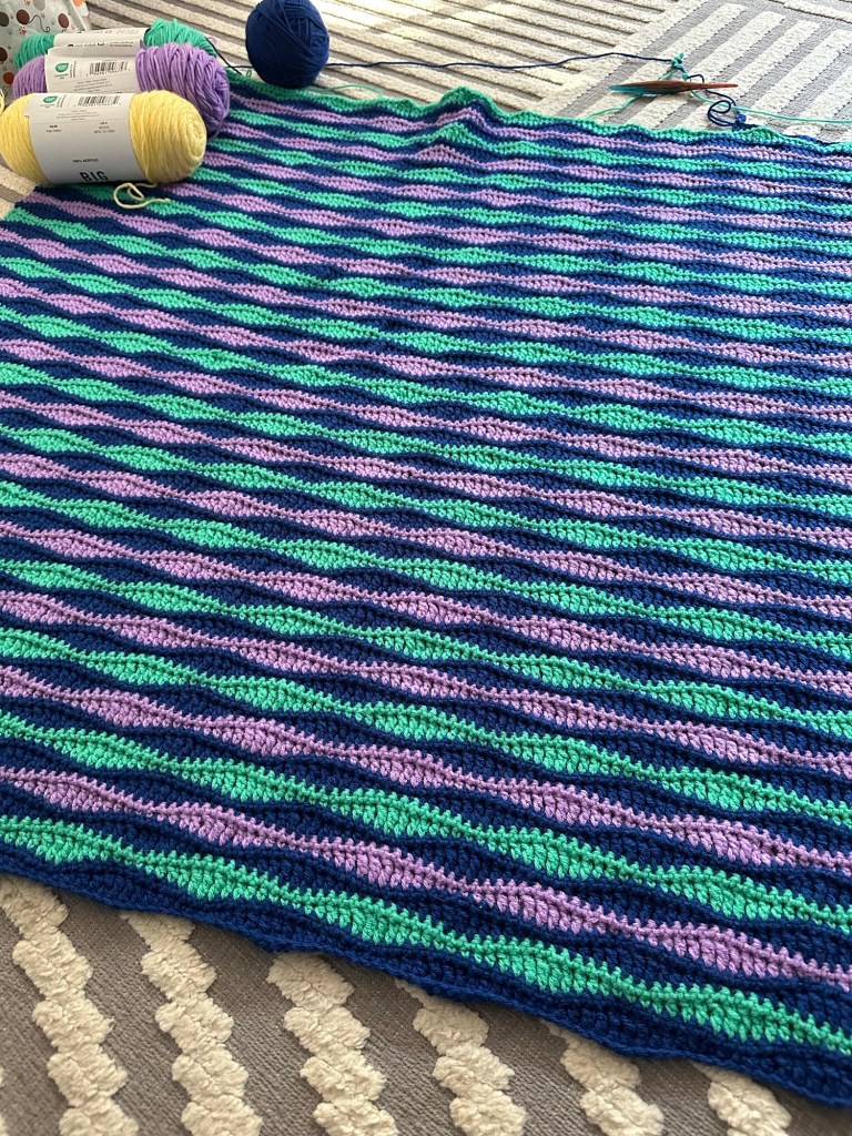 My other project is a crochet blanket. I finally laid it out on the floor. Yarn is Big Twist acrylic from Joann’s from their liquidation sale. RIP. Going to keep up in pattern until I run out of the first color and then plan from there.
